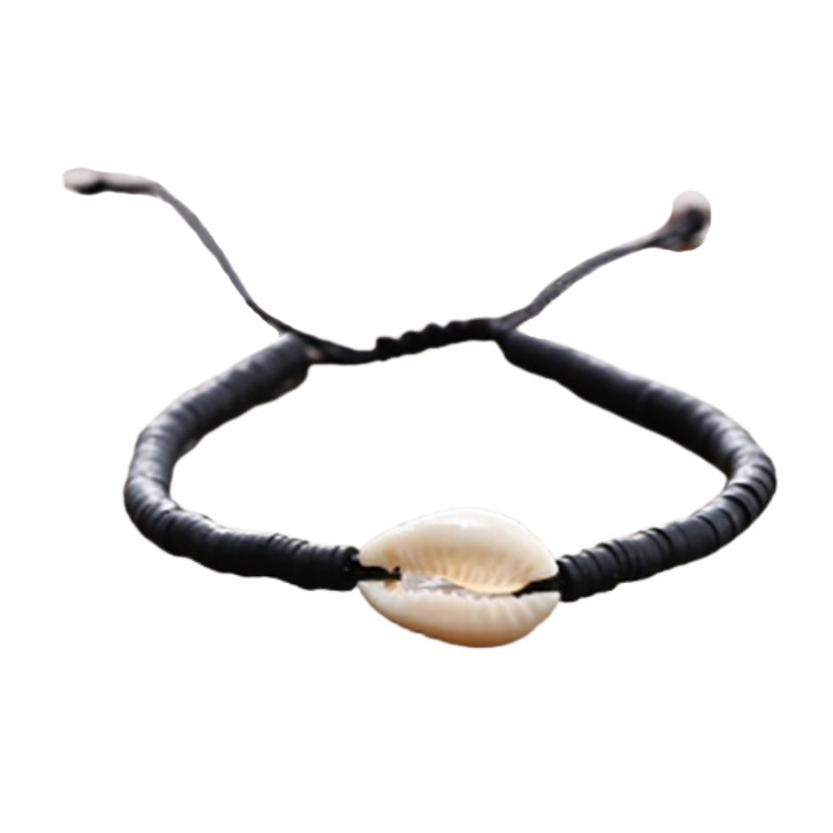 Deze prachtige armband is handgemaakt en voorzien van zwarte kleine ronde kralen en met een witte natuurlijke schelp op stevig koord. De armband beschikt over een treksluiting.