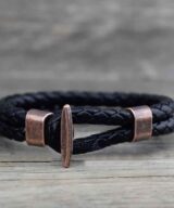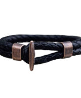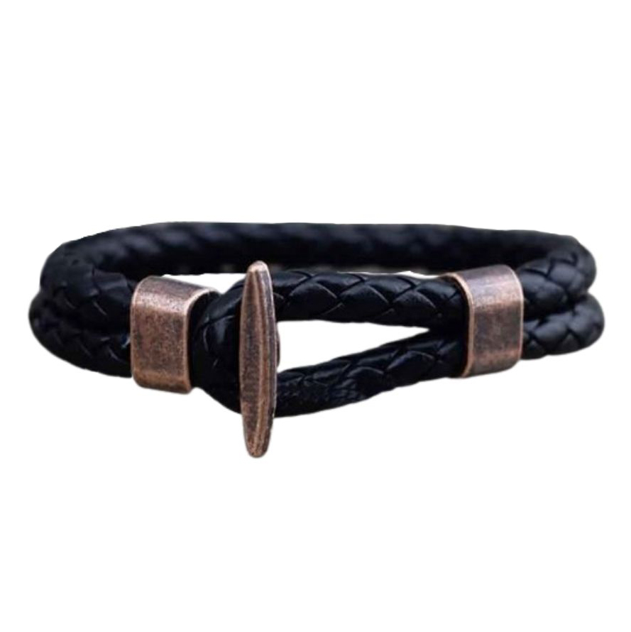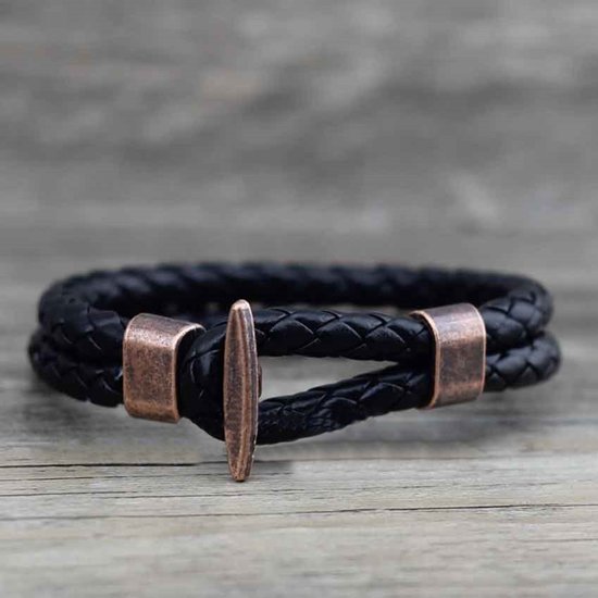 Deze prachtige handgemaakte armband is vervaardigd van geweven leer en bronskleurig metaal. Kan perfect gedragen worden door dames en heren. Door zijn knoopsluiting is hij gemakkelijk en comfortabel in gebruik. Deze handgemaakte armbanden zijn stuk voor stuk uniek! Geef hem cadeau.