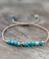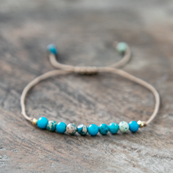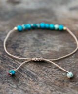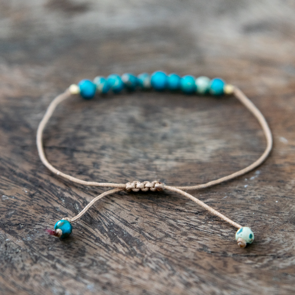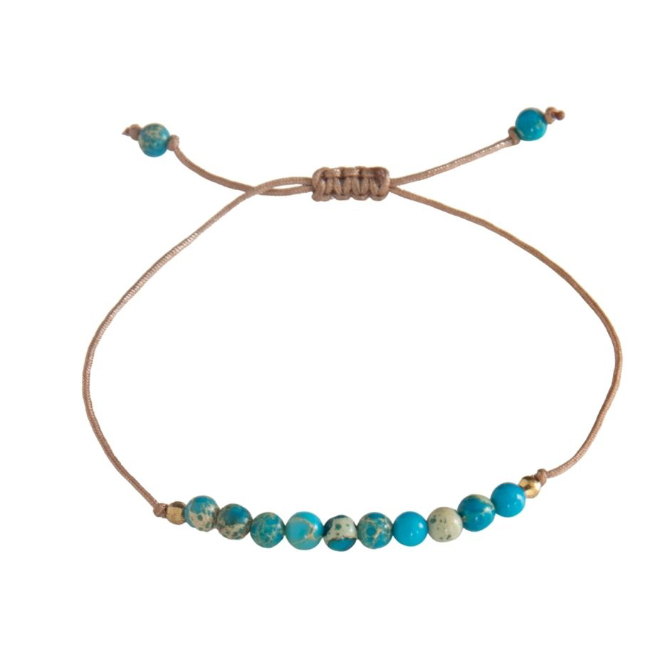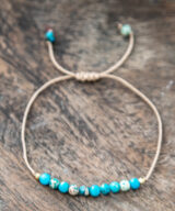 Deze minimalistische armband is gemaakt van vegan waxcord met een verstelbare sluiting, dus one size fits all! De armband beschikt over 10 gemarmerde blauwe kralen van 4 mm. Iedere armband is door zijn unieke design geschikt voor dames en heren. Leuk om te geven in onze luxe geschenkdoos.