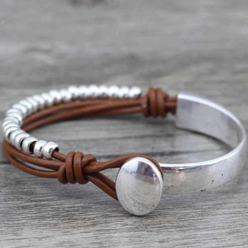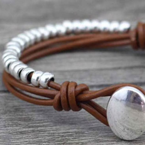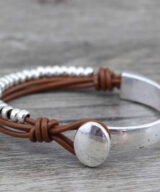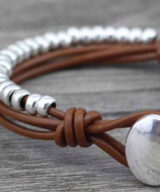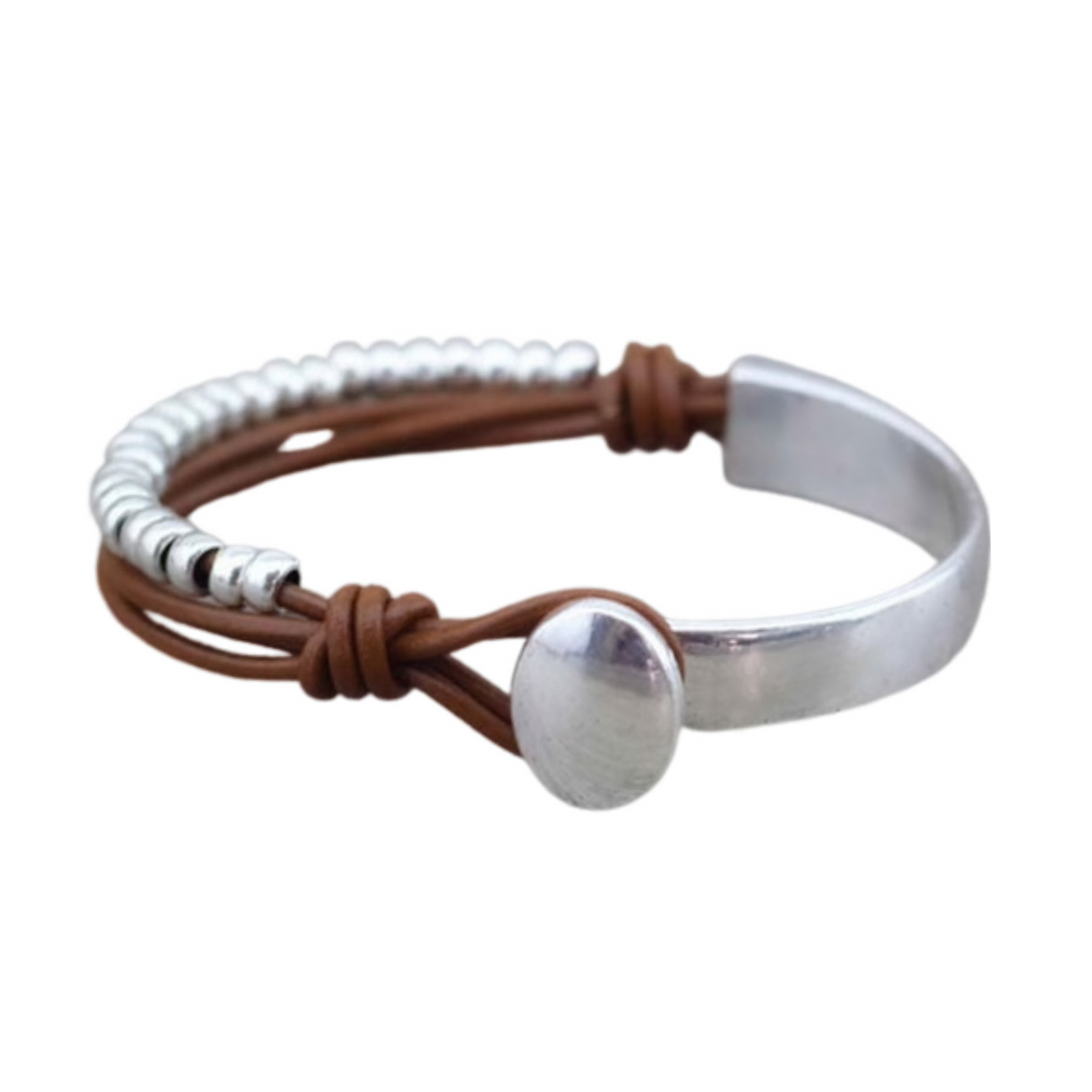 Deze mooie armband handgemaakt van bruinkleurig leer heeft een zilverkleurige knoopsluiting. Geef de armband cadeau aan een geliefde of aan jezelf!. De totale lengte van de armband is 21 cm. Draag de armband met meerdere armbanden uit deze serie voor een mooi effect, of draag hem subtiel als enkele armband.