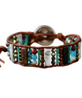 De armband is naast edelstenen voorzien van verschillende kralen in o.a. de kleuren, turquoise en goud.