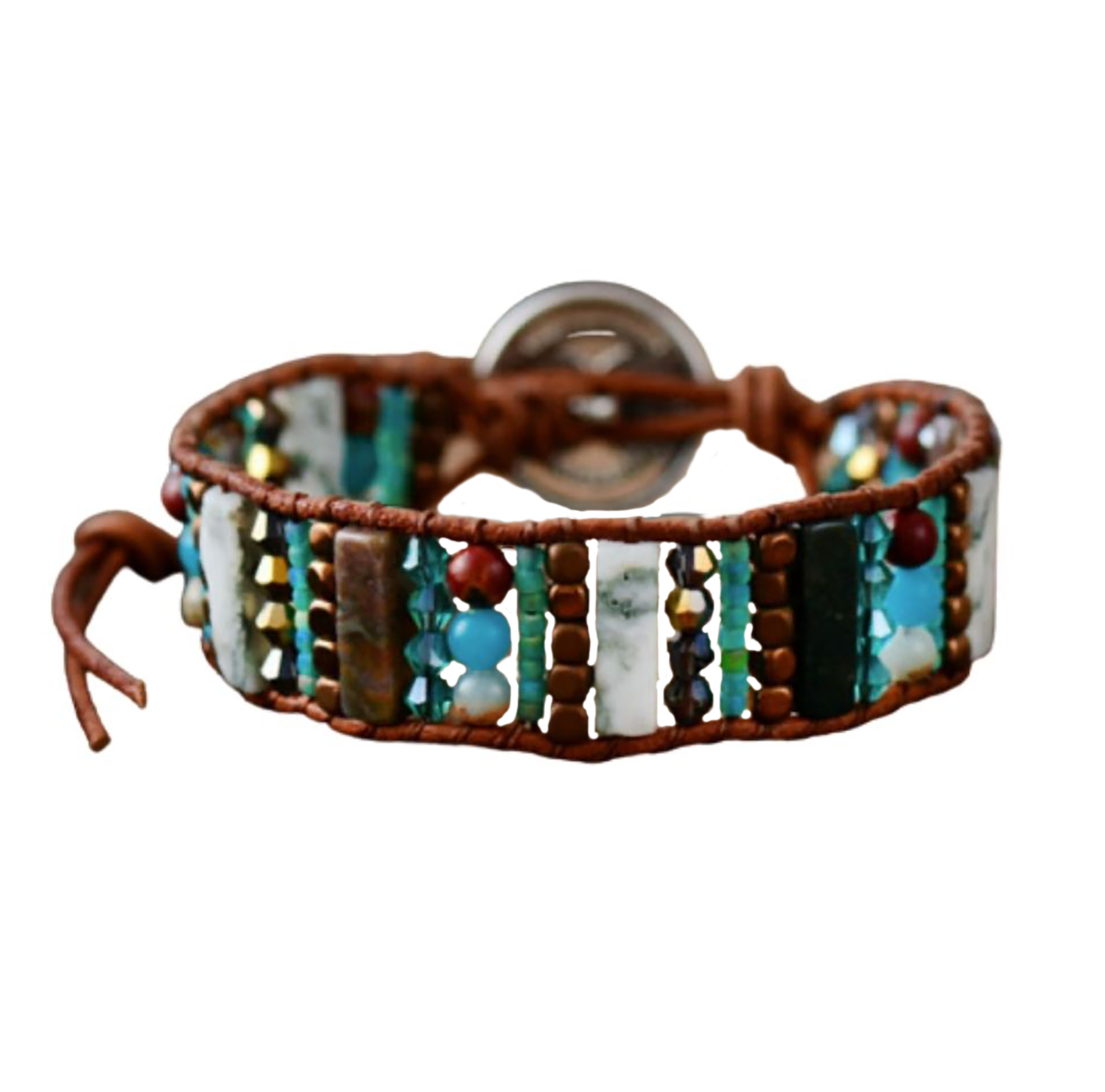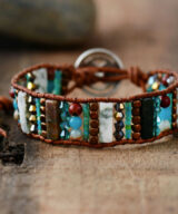 De prachtige armband Blue Skies is handgemaakt en voorzien van bruin leren koord en edelstenen zoals Jaspis en Agaat. De armband is een mooie aanvulling op je dames of heren outfit!