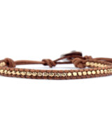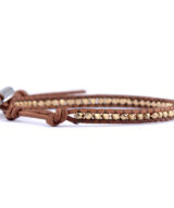 Deze prachtige handgemaakte armband is vervaardigd van bruin leer en goudkleurige zinklegering kralen. Elegant en minimalistisch design die perfect gedragen kan worden door dames en heren. Door de sluiting is de armband gemakkelijk en comfortabel in gebruik. De handgemaakte armbanden zijn vanwege de hypoallergene eigenschappen ideaal voor mensen met een gevoelige huid en wie last heeft van metaalallergie. Deze handgemaakte armbanden zijn stuk voor stuk uniek!