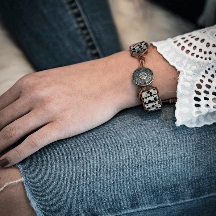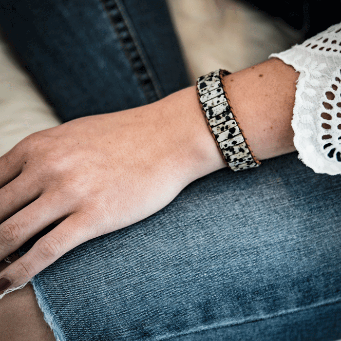 Armband van Lichtbruin Leer met Dalmatier Jaspis Edelsteen – Stijlvolle en Unieke Accessoire