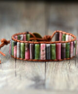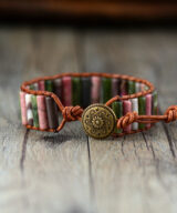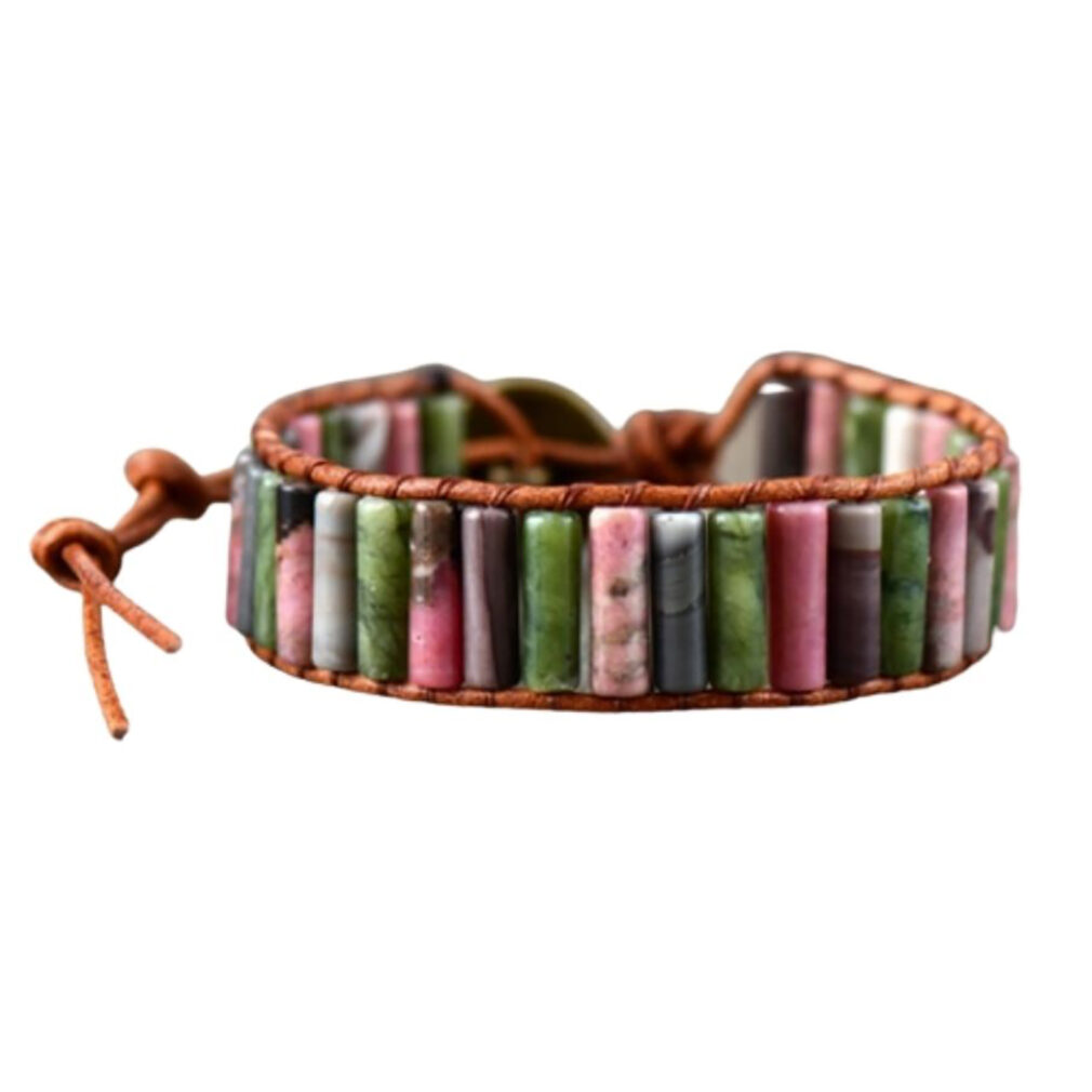 De prachtige armband is handgemaakt en voorzien van bruin leren koord en pastelkleurige Jaspis edelstenen. De armband is een mooie aanvulling op iedere dames outfit!