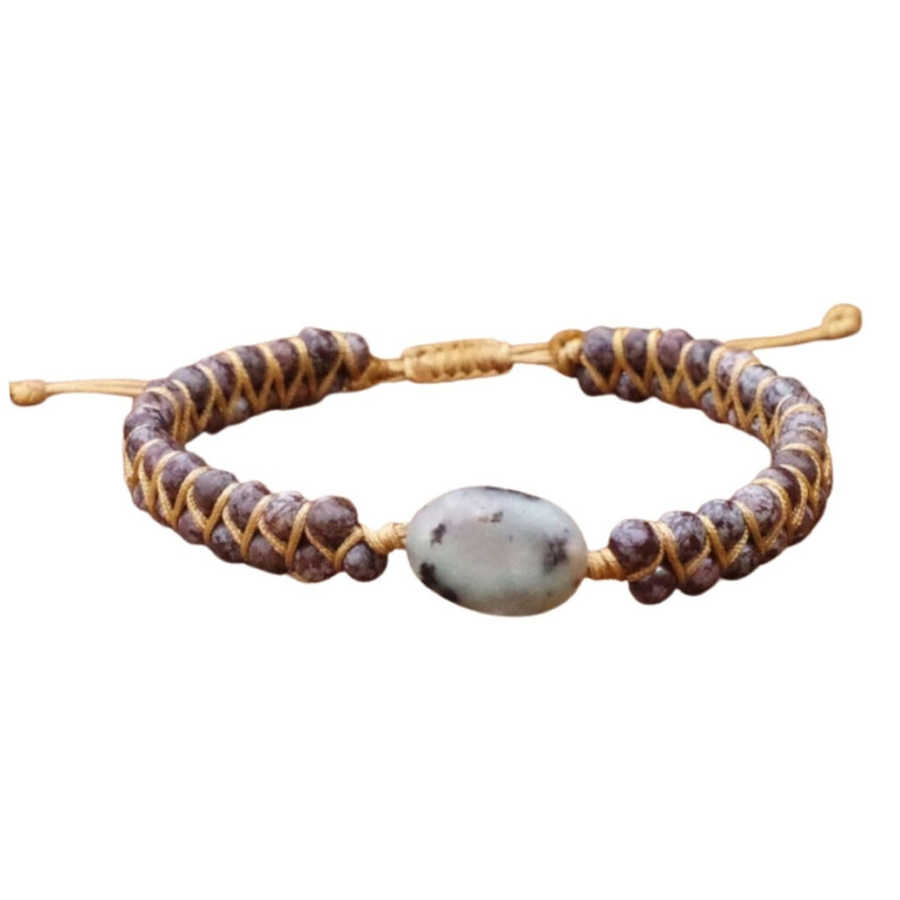 Deze schitterende vegan armband is handgemaakt van bruin vegan waxcord en edelstenen. De armband is vervaardigd van bruine en een zwart-witte Jaspis edelsteen. Door zijn unieke edelstenen lijkt het net alsof jij de universum om je pols draagt. Perfect te dragen door dames en heren.Het lichtbruine waxcord heeft een verstelbare sluiting, dus is het one size fits all!