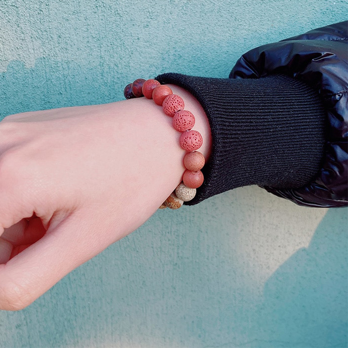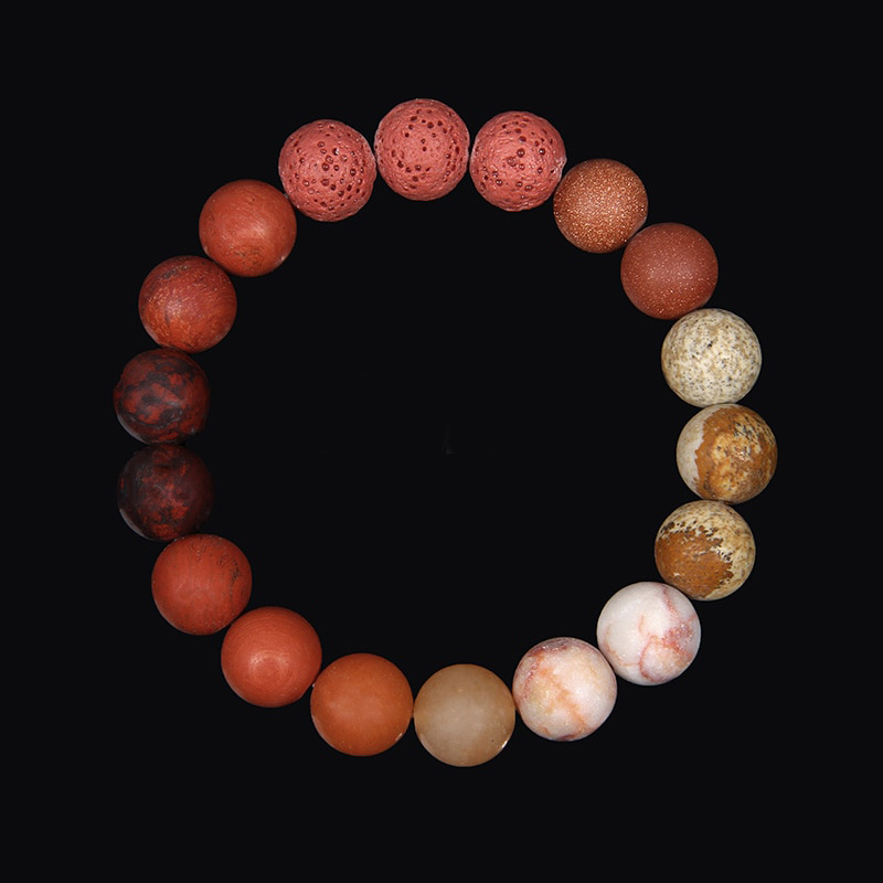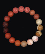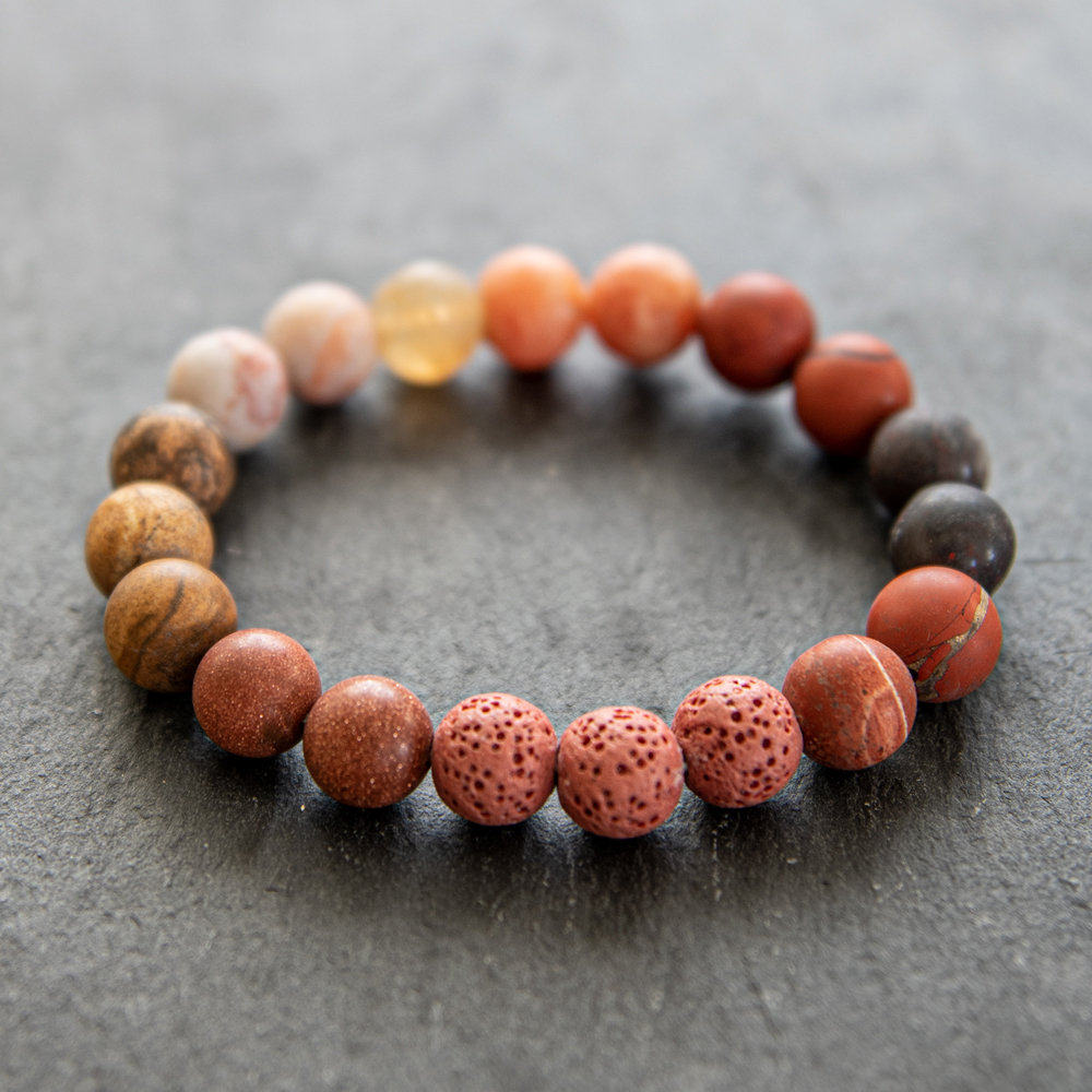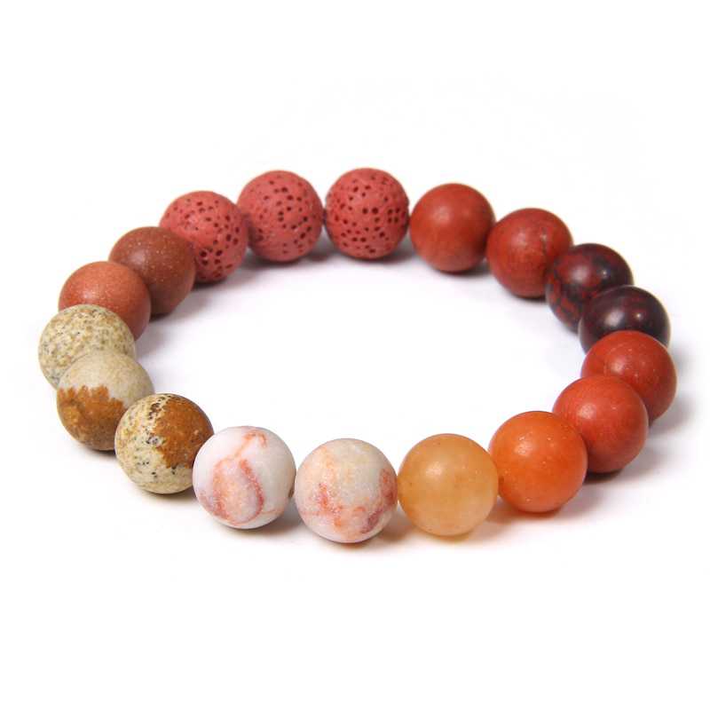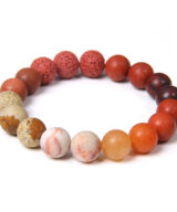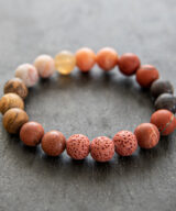 Deze prachtige vegan armband is handgemaakt en voorzien van verschillende ronde kralen vervaardigd uit half-edelstenen zoals oranje kristal, lavasteen en picasso jaspis. De matte kralen zijn geregen op een stevig elastiek. Een trendy aanvulling op je outfit! Een natuurlijke uitstraling met een subtiel effect.