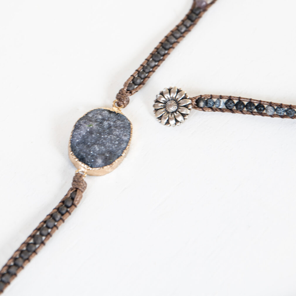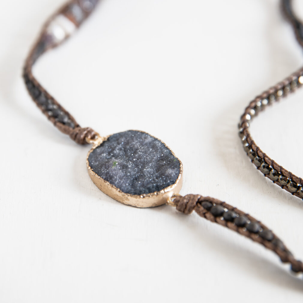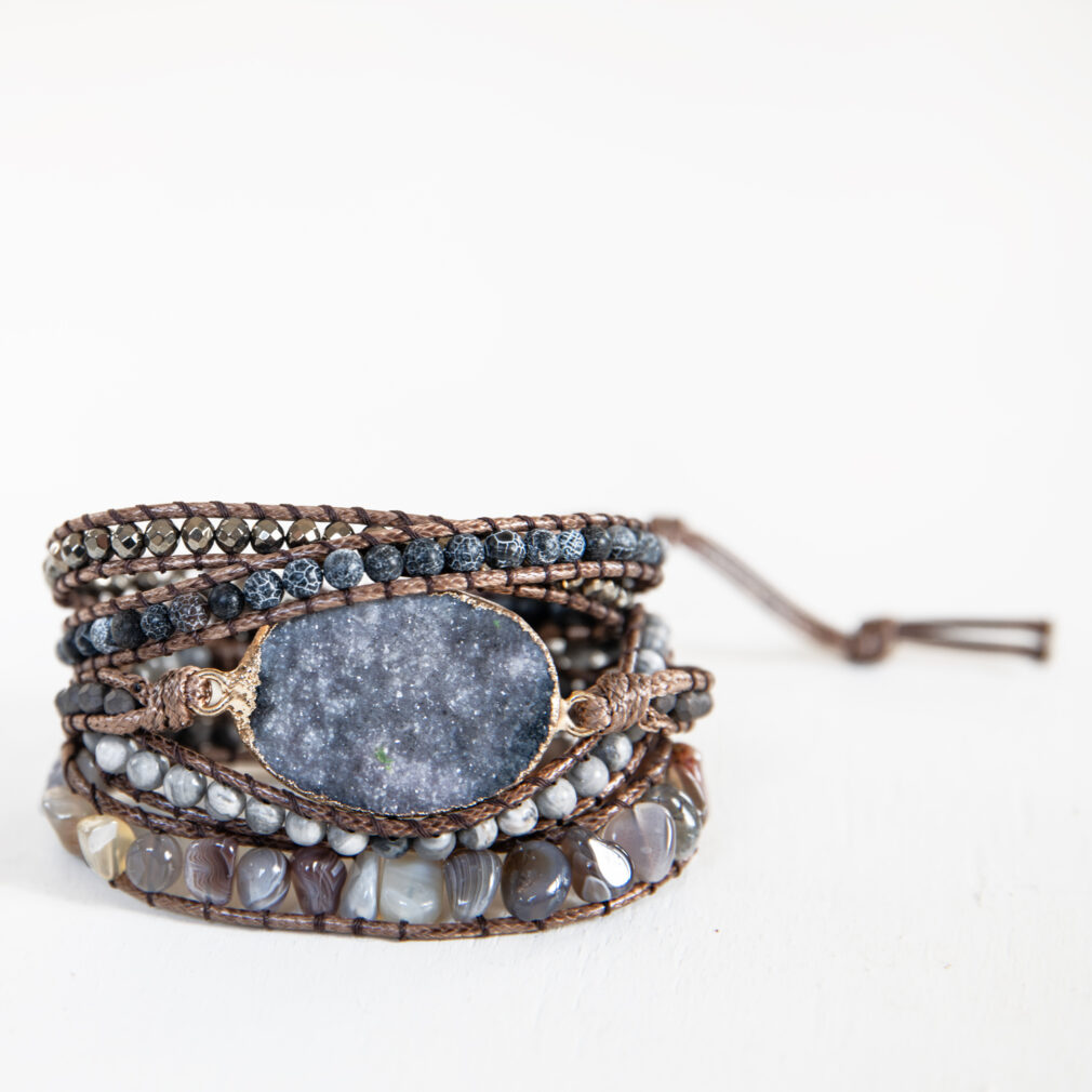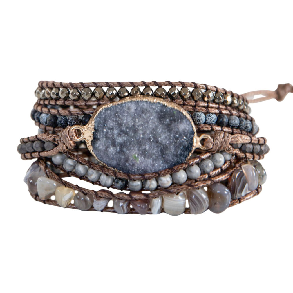 Door de neutrale kleuren en grijstinten kun je deze wikkel armband perfect casual of chique dragen! De armband heeft als hoofdsteen een grijze Druzy steen, daarnaast kleine natuurstenen in grijs en bruintinten en goudkleurige kralen. Deze armband wordt verzonden in een luxe geschenkverpakking.