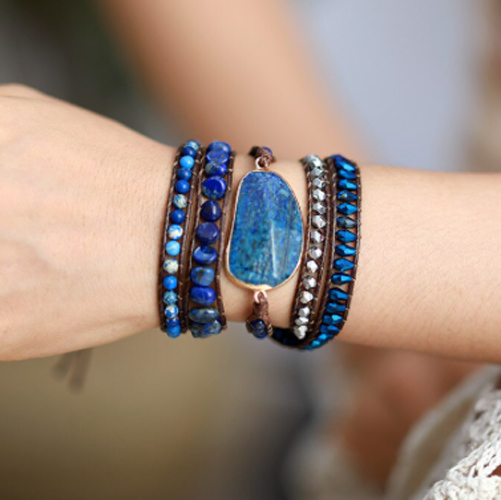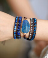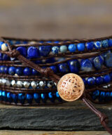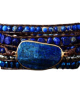 Deze prachtige handgemaakte armband is gemaakt van leer en edelstenen. Door zijn neutrale kleuren past hij perfect bij iedere dames of heren outfit! De armband heeft als hoofdsteen blauwe Jaspis, daarnaast als kleine edelstenen lapis, kristal en labradoriet. Geef deze prachtige armband als cadeau in onze luxe geschenkdoos.
