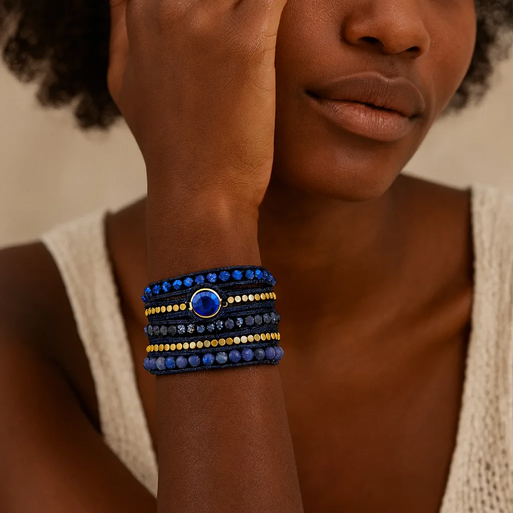 Luxe Handgemaakte Wikkelarmband met Blauwe Edelsteen Kristal – Bohemian Chic – Verstelbaar – Premium Kwaliteit