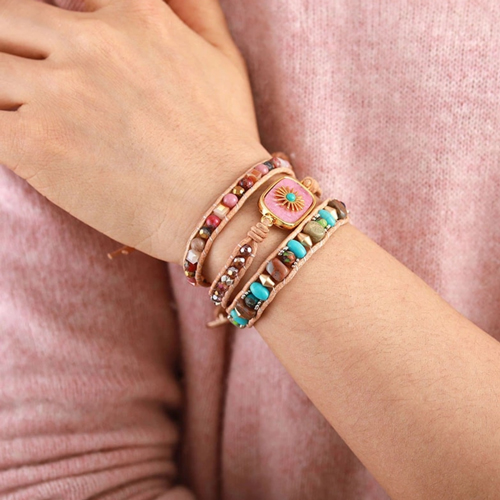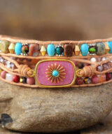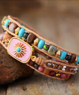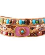 Deze schitterende armband is handgemaakt van leer en edelstenen. De grote steen is een roze Rhodoniet met daarop een goudkleurig zonnetje. Wees het zonnetje in huis met deze armband om je pols. Geschikt voor dames. De armband past 3x om je pols. De wikkelarmband is 50 cm lang en heeft 3 sluitingen, dus one size fits all! Geleverd in een luxe geschenkdoos.