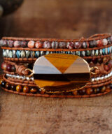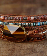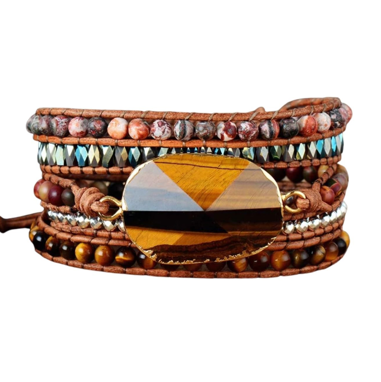 Deze schitterende armband is handgemaakt van leer en edelstenen. De grote steen is Gouden Tijgeroog. Maak jou dames outfit helemaal af met deze prachtige armband. De armband past 5x om je pols.