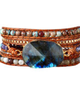 Deze schitterende armband is handgemaakt van leer en edelstenen. De grote steen is Labradoriet. De armband past 5x om je pols. Perfect te combineren met een dames outfit.