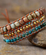 Deze schitterende armband is handgemaakt van bruin leer en edelstenen. De armband is vervaardigd van Jaspis edelstenen en kralen. De armband past 5x om je pols.