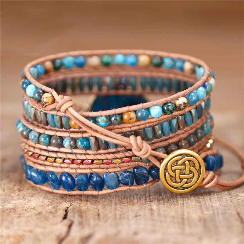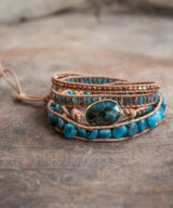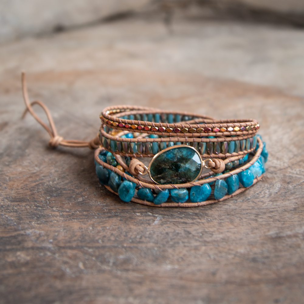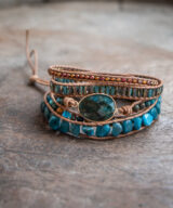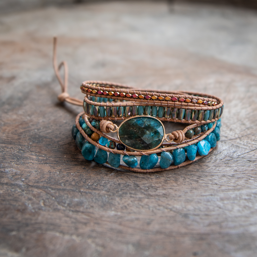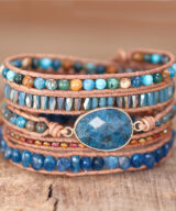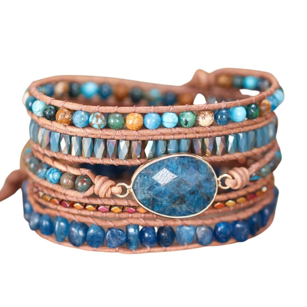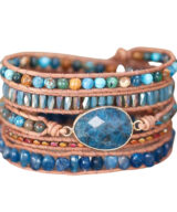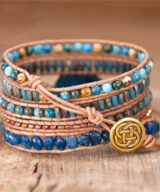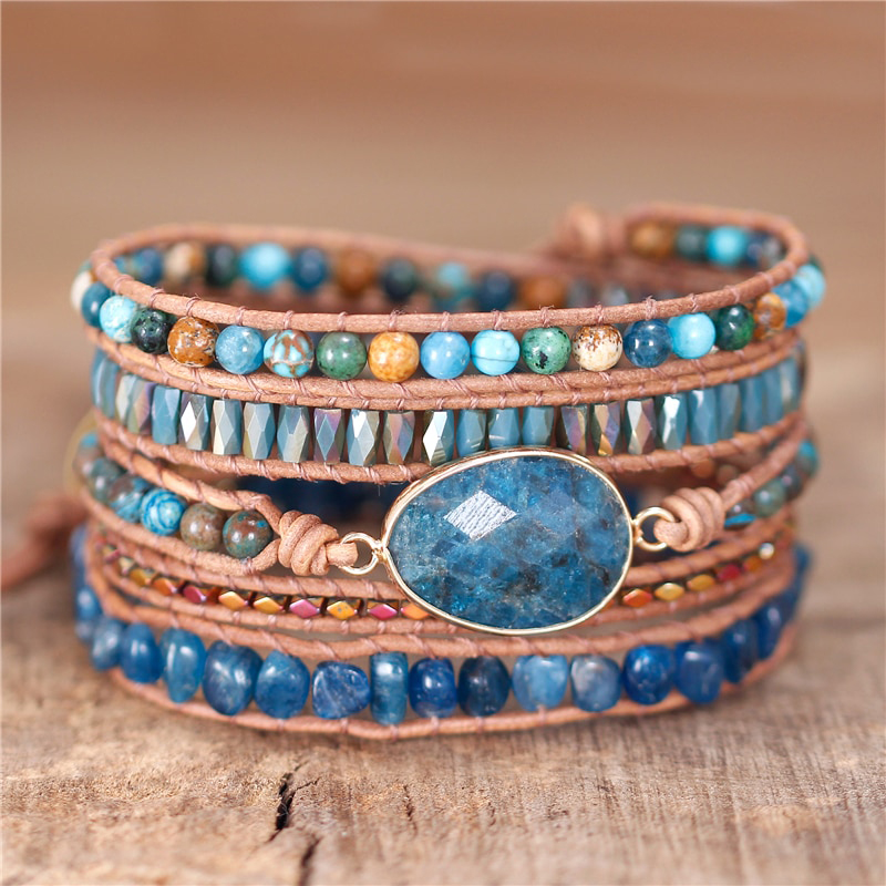 Deze prachtige armband is handgemaakt en voorzien van lichtbruin leren koord en een blauwe apatiet edelsteen. De kleine ronde kralen zijn vervaardigd uit kristal en jaspis. De armband is een mooie aanvulling op je outfit! Een natuurlijke uitstraling die iedere man en vrouw laat stralen.