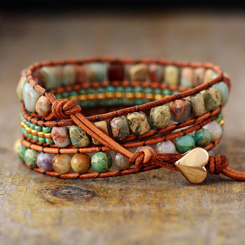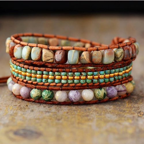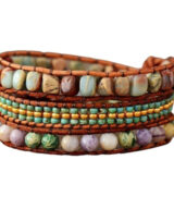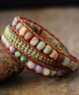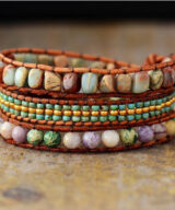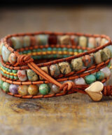 Deze schitterende armband in aardetinten is handgemaakt van leer, de edelsteen jasper en halfedelstenen. De natuurlijke uitstraling zorgt ervoor dat die gedragen kan worden door dames en heren. De armband past 3x om je pols.