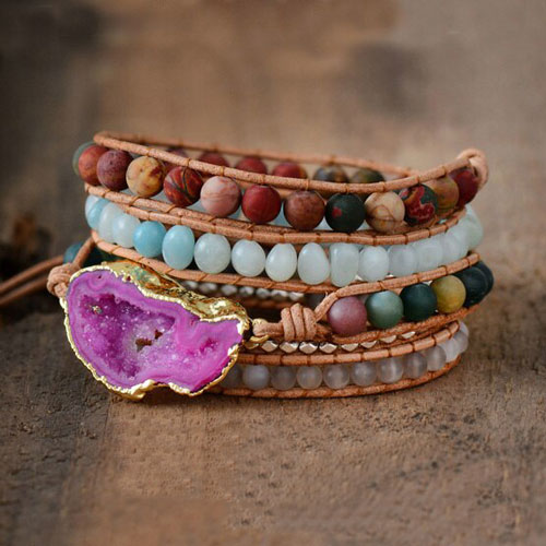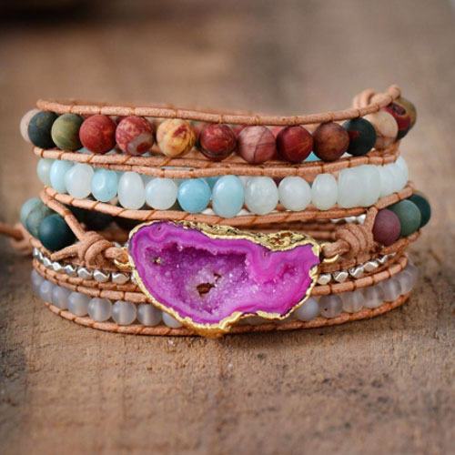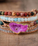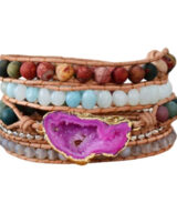 Deze schitterende armband is handgemaakt van bruin leer en edelstenen. De grote steen is Onyx. Zoals ze wel eens zeggen: Pretty in pink voor de dames. De armband past 5x om je pols.