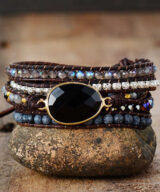 Deze prachtige handgemaakte armband is gemaakt van leer en edelstenen. Door zijn neutrale kleuren past hij perfect bij iedere dames of heren outfit! De armband heeft een mooi Onyx edelsteen. Onyx is een doorschijnende steen met een matte tot zijdeglans. Draag deze armband tijdens jouw volgende feestje. Wordt geleverd in een luxe geschenkdoos.