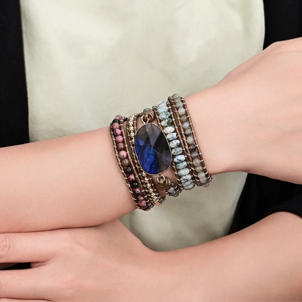 De Marama Armband Misty Blue is de perfecte accessoire voor elke dame die houdt van stijl en elegantie. Deze prachtige armband, gemaakt van hoogwaardig leer en voorzien van een schitterende edelsteen labradoriet, is een echte blikvanger. Het ontwerp is een wikkelarmband, wat betekent dat hij vijf keer om je pols gewikkeld kan worden voor een speels en gelaagd effect.