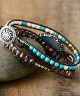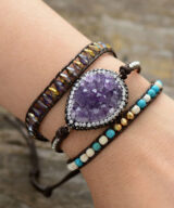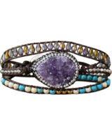 Deze schitterende wikkelarmband is handgemaakt van leer en edelstenen. De grote steen is een paarse Amethist. Je schittert tijdens jouw volgende feestje met deze damesarmband om je pols. De armband past 3x om je pols.
