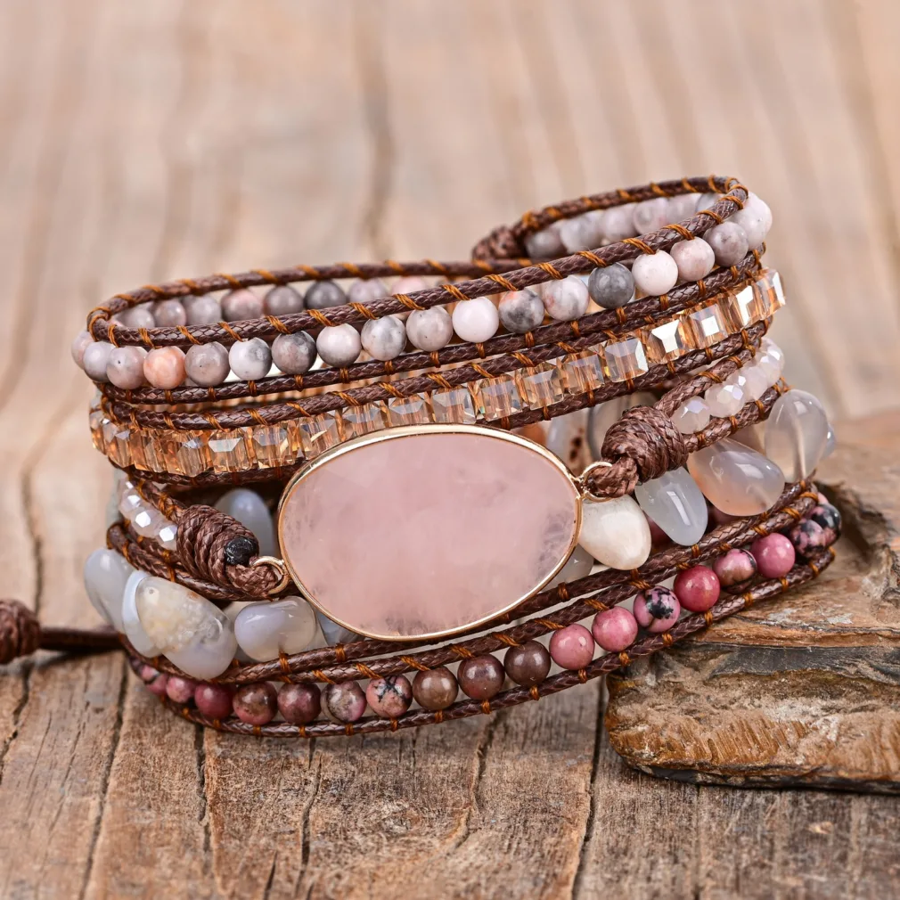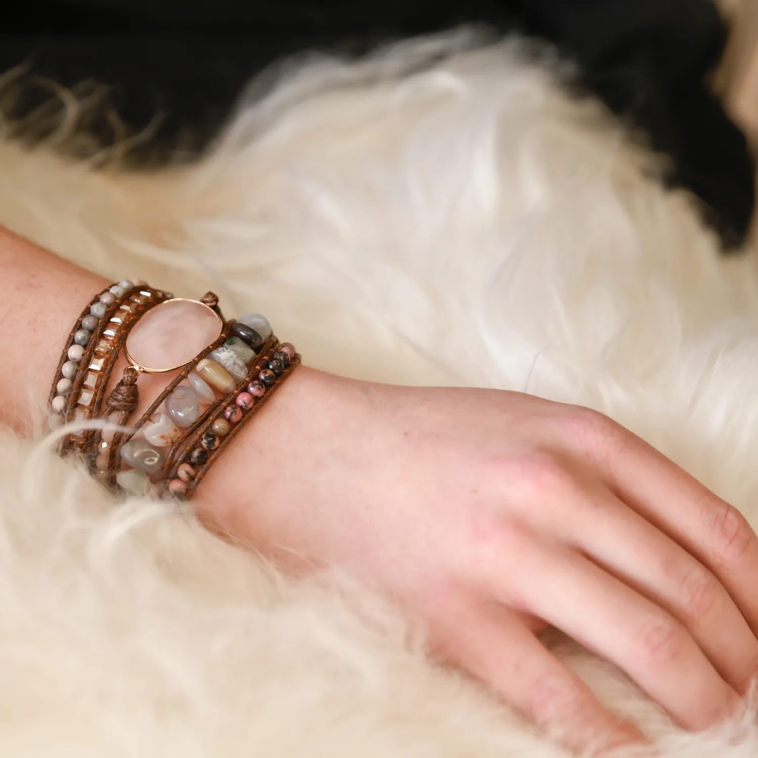 Ontdek de elegante charme van de Marama Wikkelarmband Rose. Deze prachtige armband combineert de zachte schoonheid van roze edelstenen met het stoere uiterlijk van bruin leer. Met een lengte van 90 cm past deze one size fits all armband perfect bij elke gelegenheid.