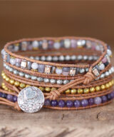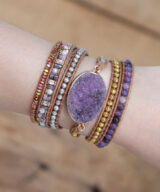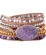 Deze schitterende armband is handgemaakt van leer en edelstenen. De grote steen is een paarse Amethist. Je schittert tijdens jouw volgende feestje met deze dames armband om je pols. De armband past 5x om je pols.