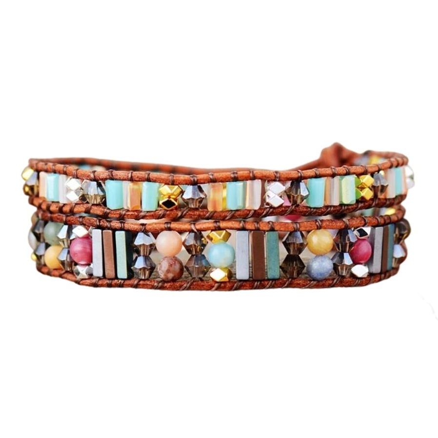 De prachtige armband is handgemaakt en voorzien van bruin leer, goudkleurige kralen en halfedelstenen. Een mooi design geschikt voor dames en heren. De armband is een trendy aanvulling op je outfit!