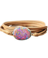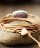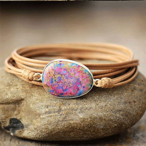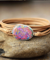 Deze trendy lichtbruin leren armband is voorzien van de paars-turquoise edelsteen Jaspis. Geef jou dames of heren outfit een kleurrijke vibe met deze prachtige leren armband.