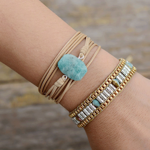 Wikkelarmband Edelsteen Rechthoekig Amazoniet Lichtbruin Waxcord