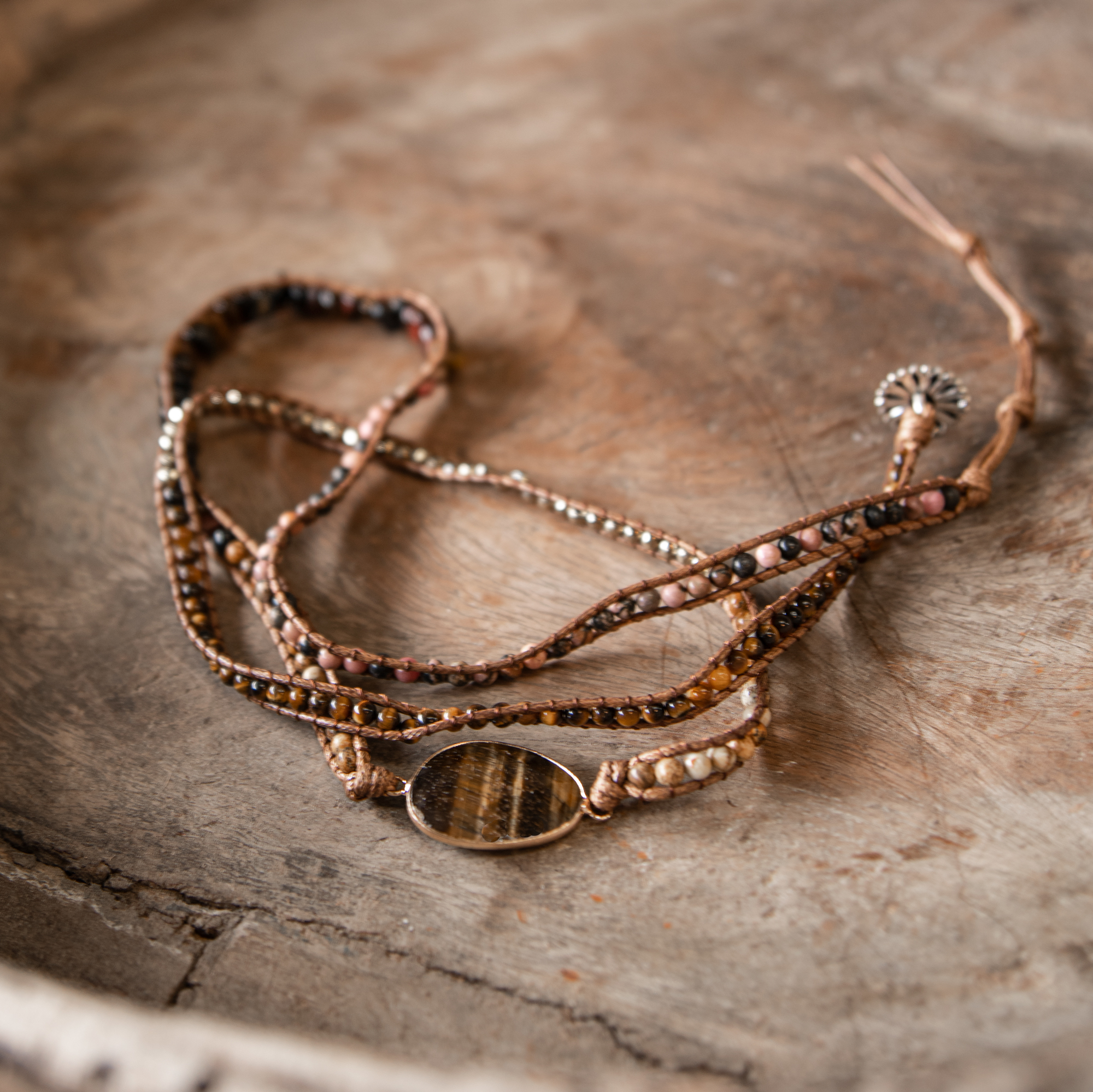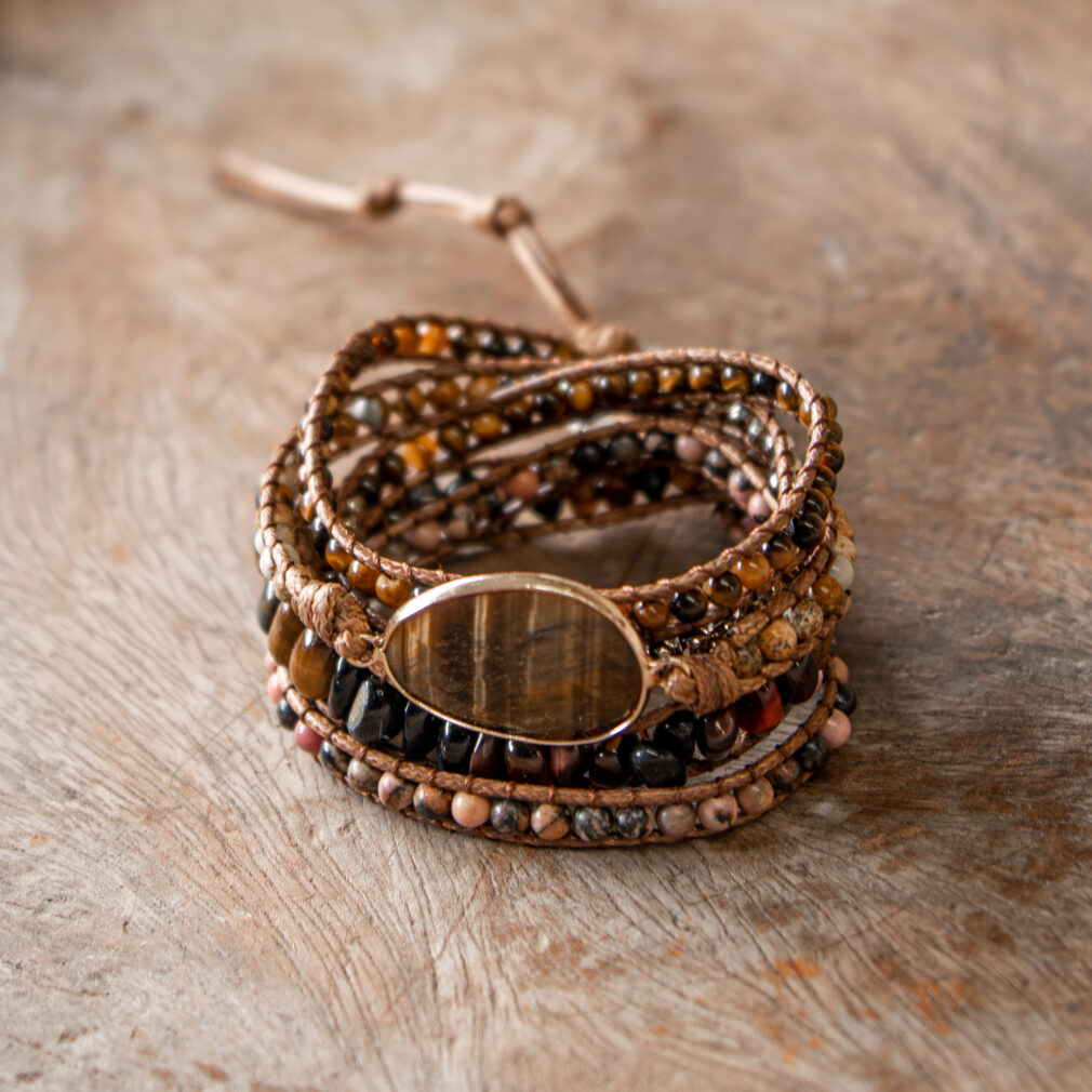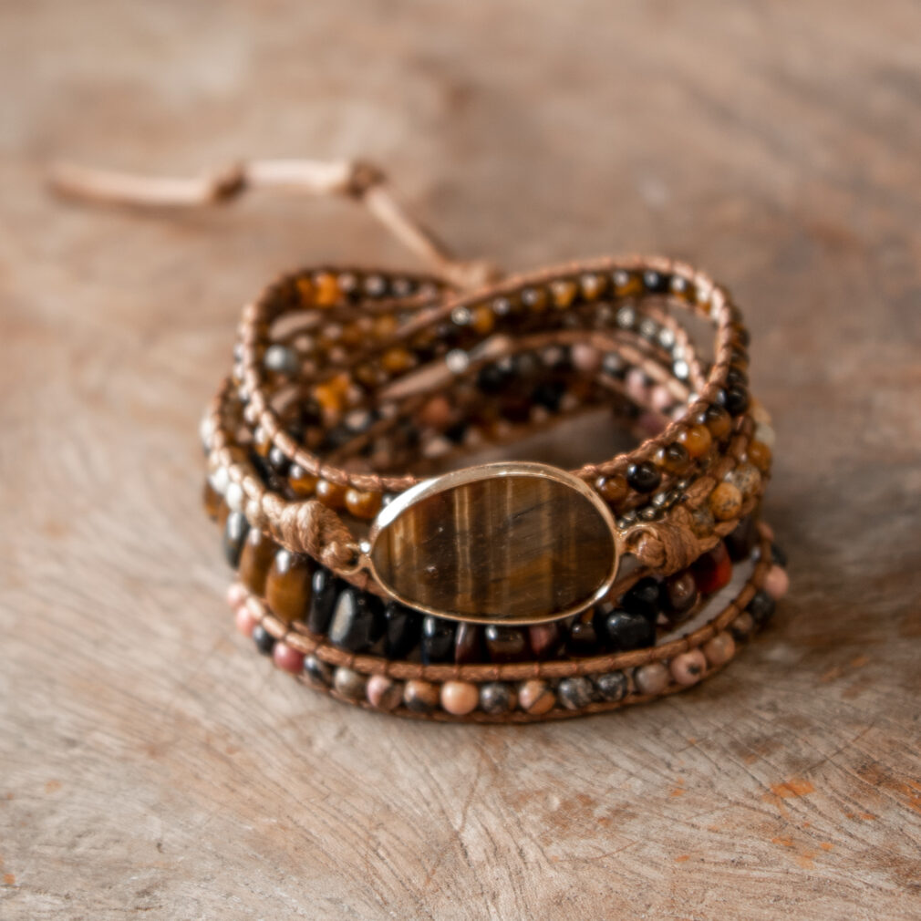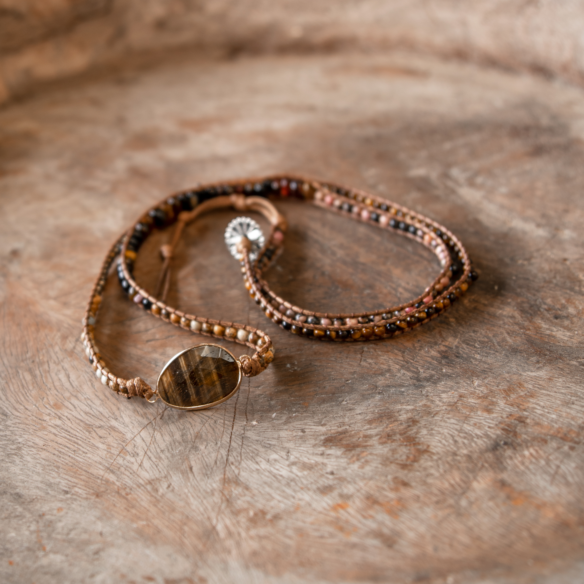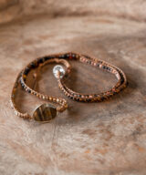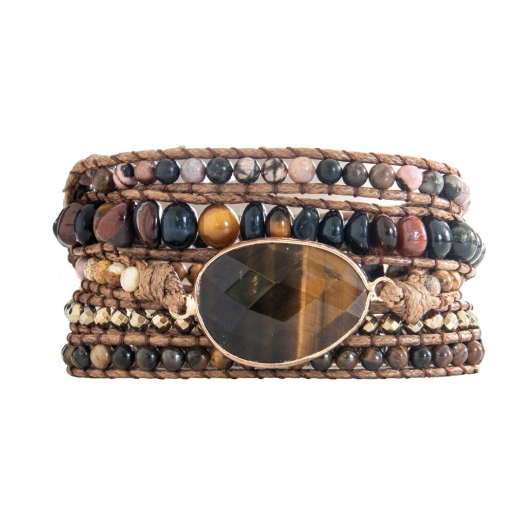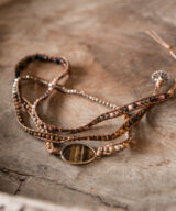 Deze schitterende armband is handgemaakt van waxcord en edelstenen. De grote steen is Tijgeroog. De armband past 5x om je pols. Voor dames het perfecte sieraad om te dragen bij jouw outfit.