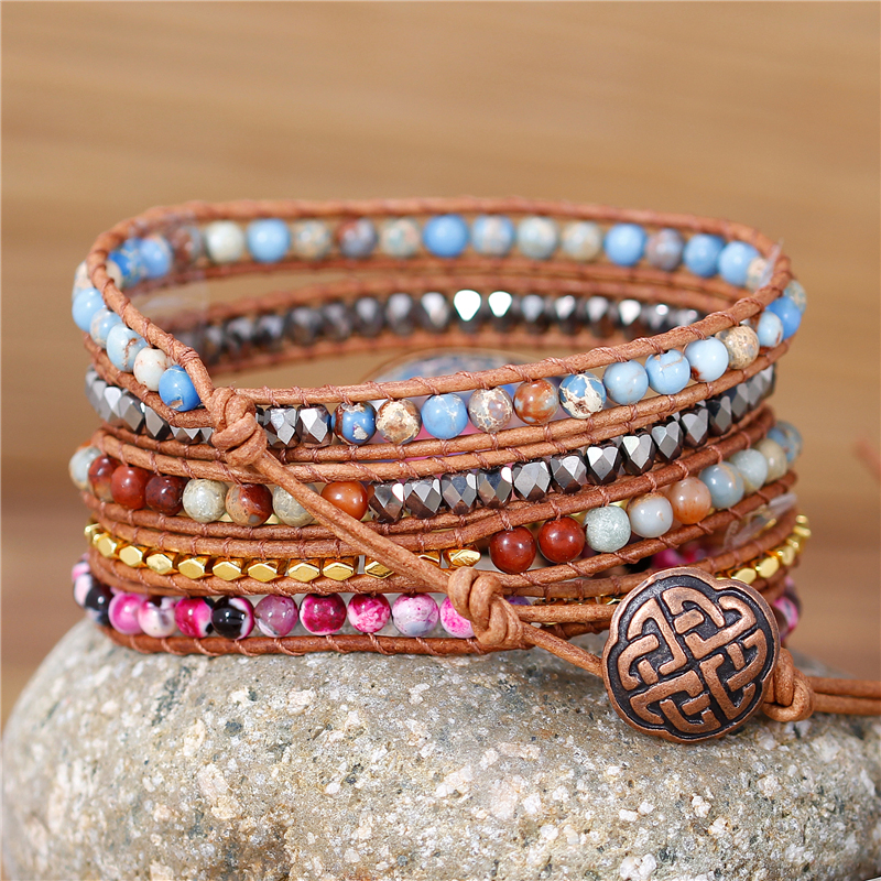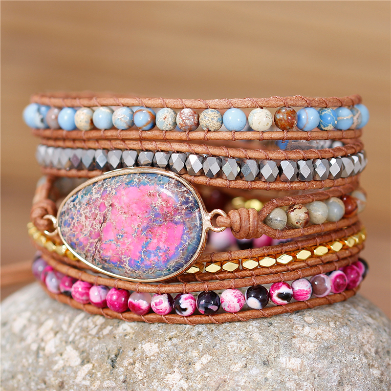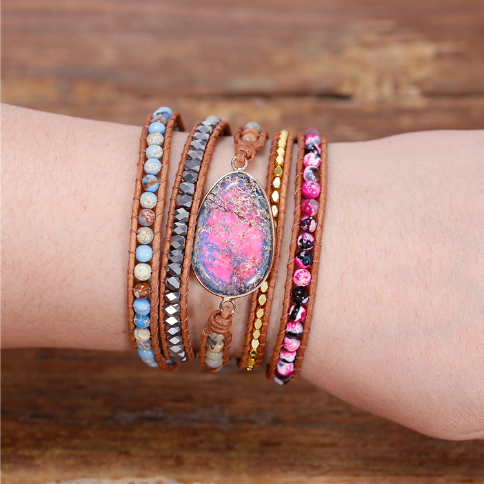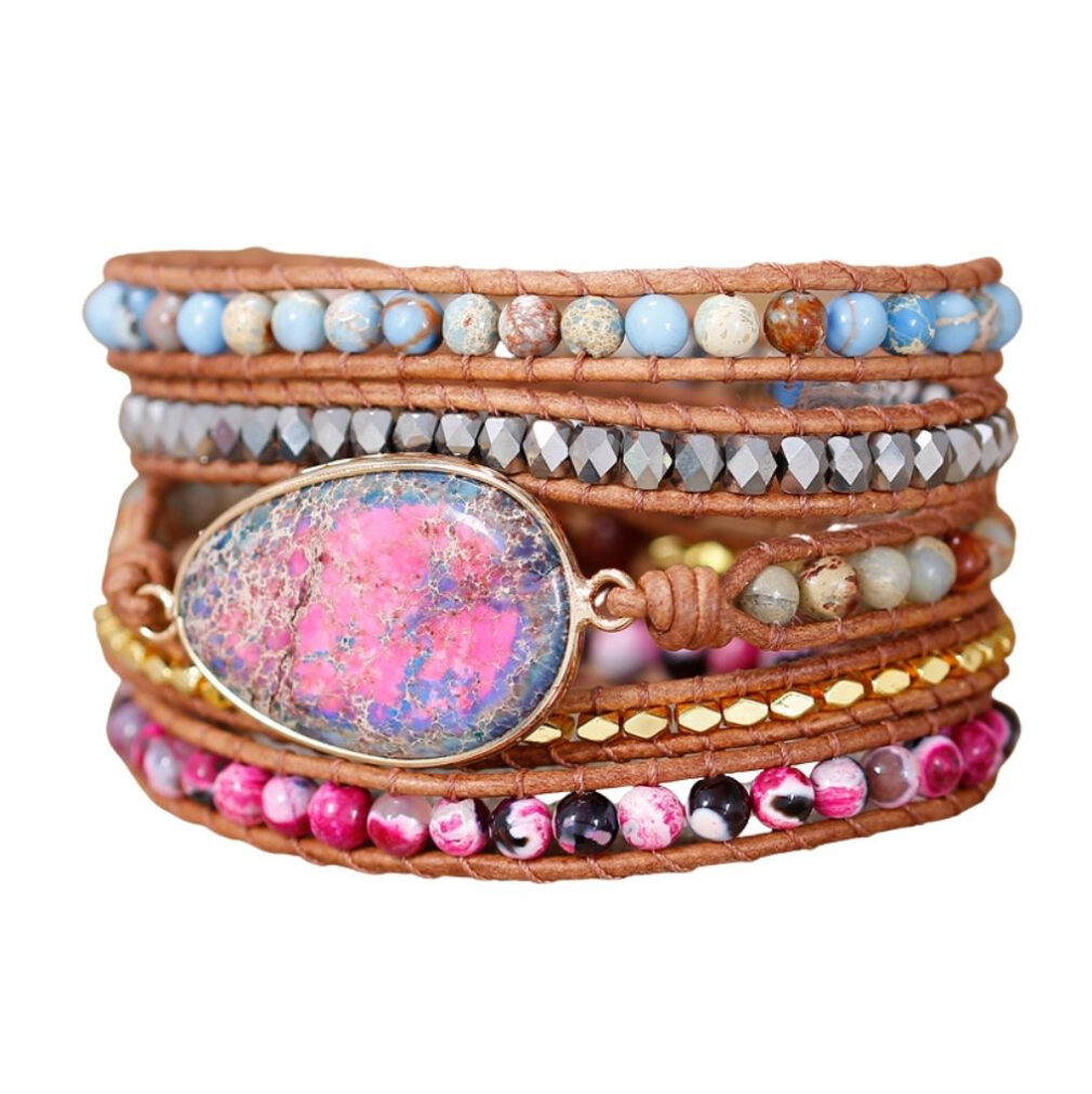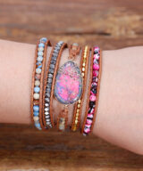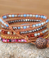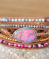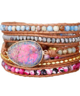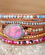 Deze trendy wikkel armband is voorzien van de paars-turquoise edelsteen Jaspis. Geef je damesoutfit een kleurrijke vibe met deze prachtige leren armband.