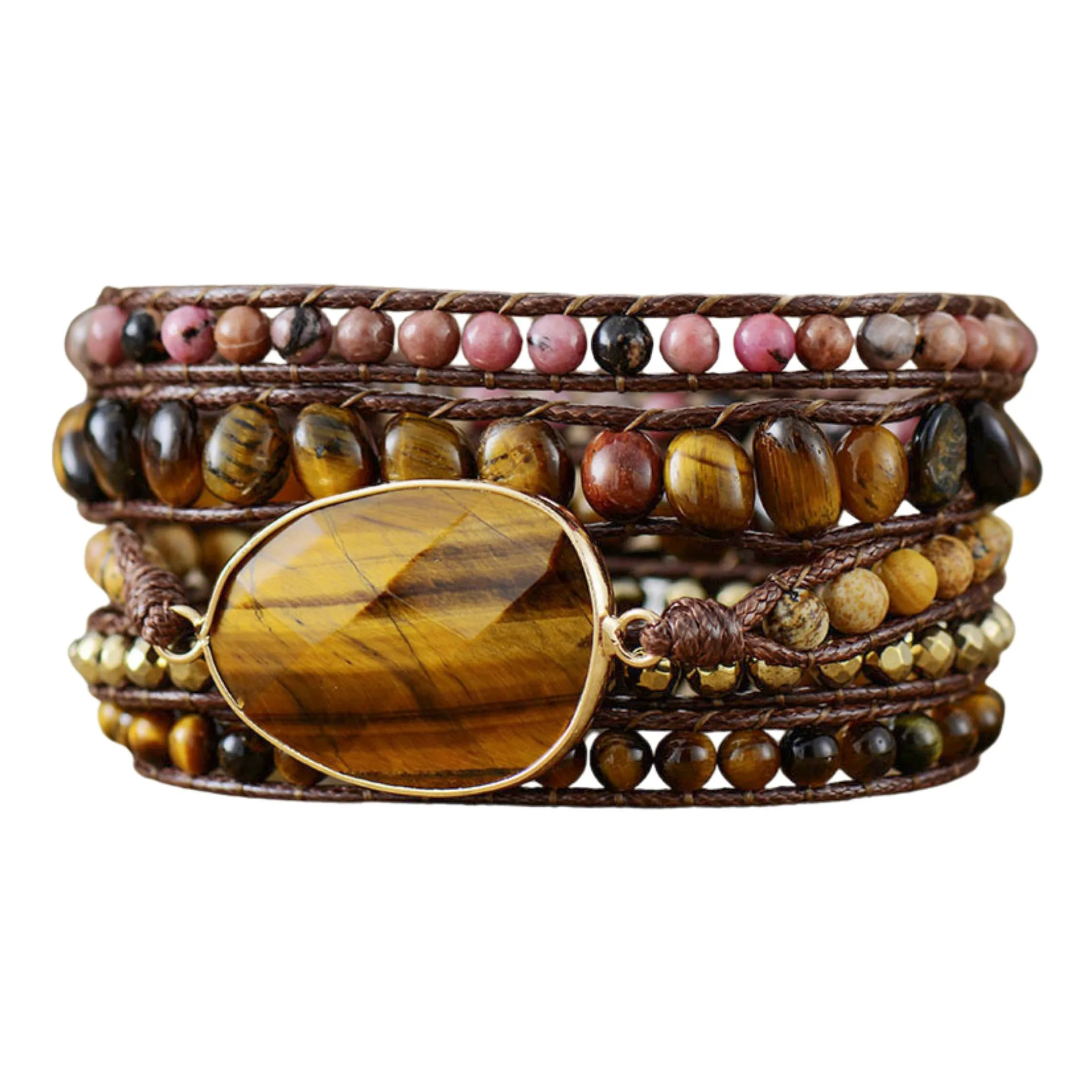 De armband heeft als hoofdsteen de prachtige edelsteen tijgeroog, die bekend staat om zijn warme, aardse uitstraling en beschermende eigenschappen. Daarnaast is de armband afgewerkt met natuurstenen kralen in subtiele bruin- en roze tinten, wat zorgt voor een vrouwelijke en verfijnde look. De goudkleurige kralen voegen een vleugje luxe toe, terwijl het gebruik van vegan waxcord duurzaam is.