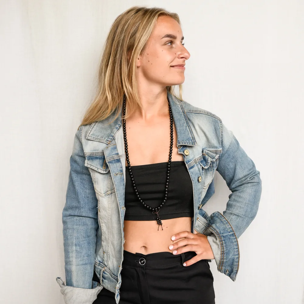 Met zijn elastische ontwerp past de armband zich moeiteloos aan elke pols aan. De combinatie van zwarte kralen en het warme hout van de mala geeft je outfit een stijlvolle touch. Deze armband is ideaal voor volwassenen die houden van een tijdloze stijl met een spirituele touch.
