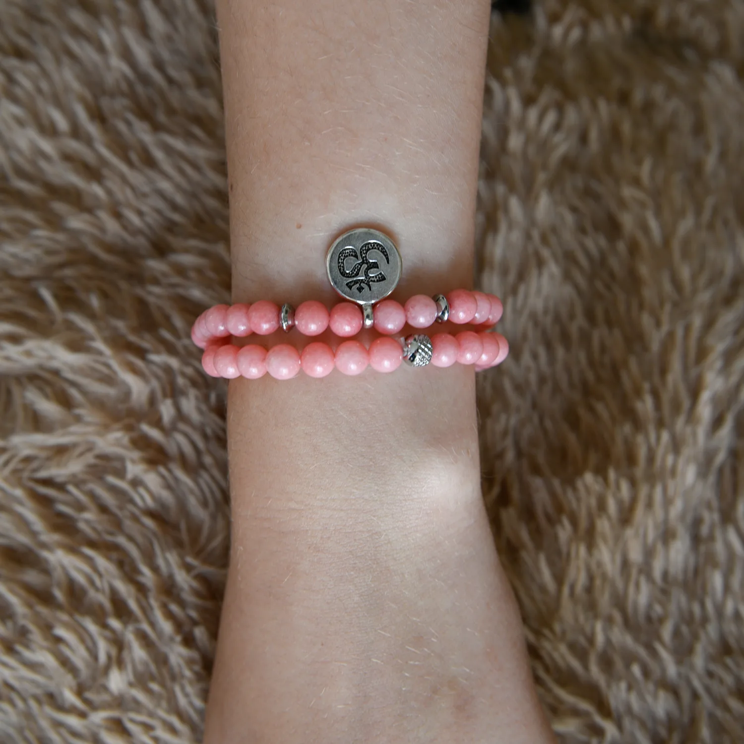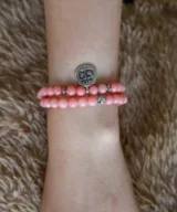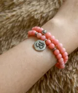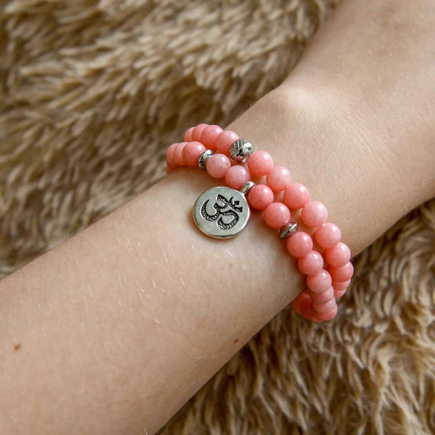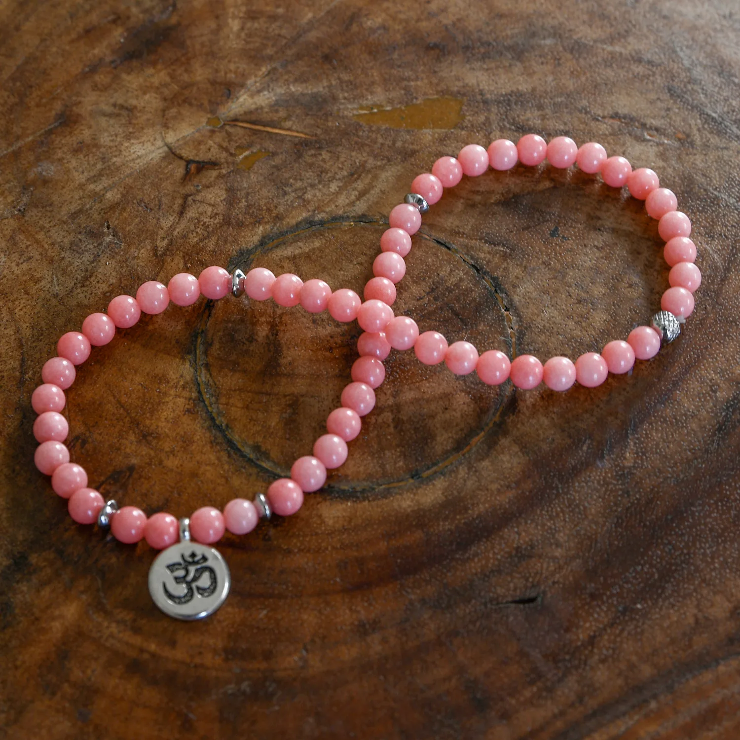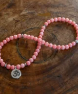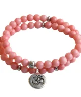 Wikkelarmband Ohm Sunstone – Roze edelsteen en zilverkleurige Ohm hanger
