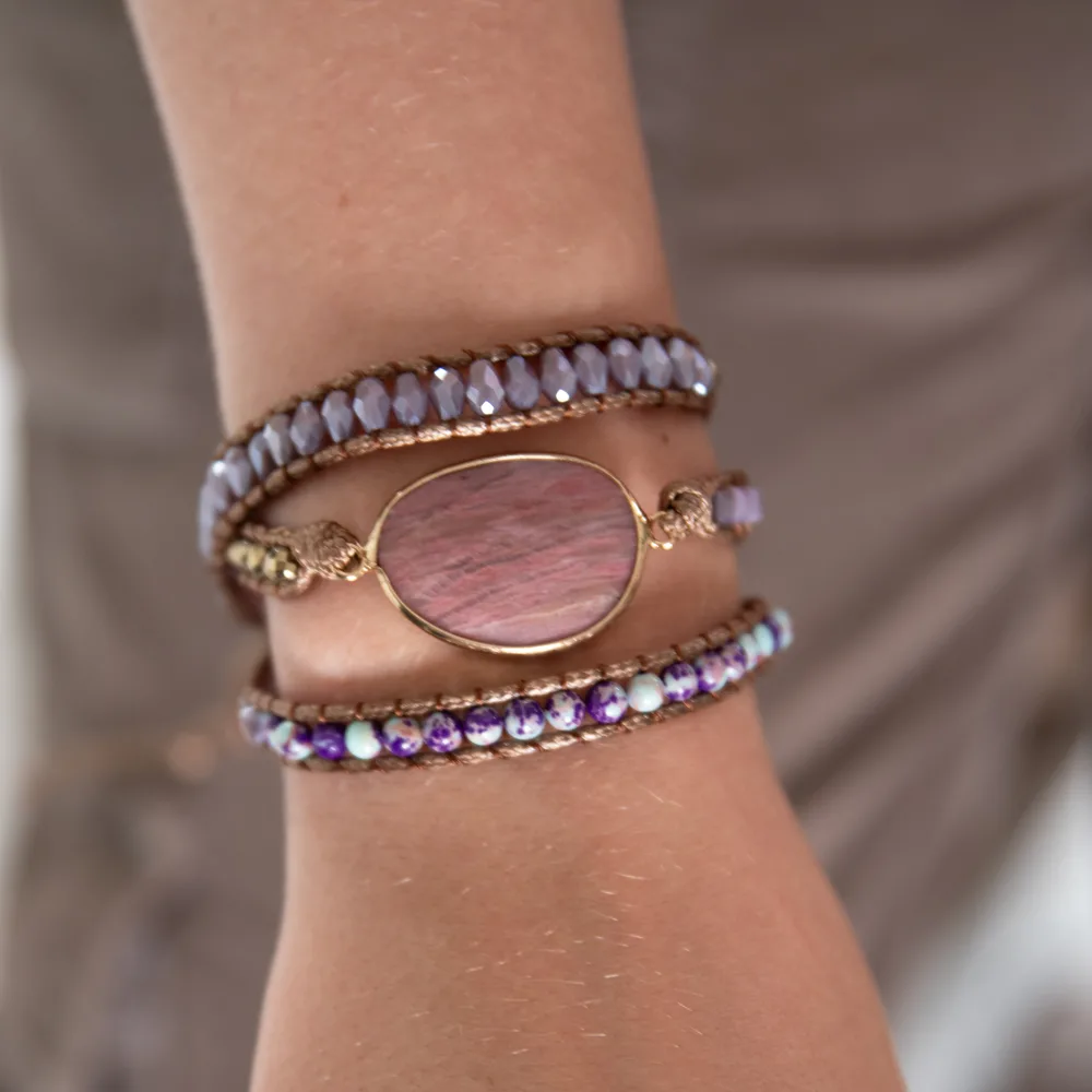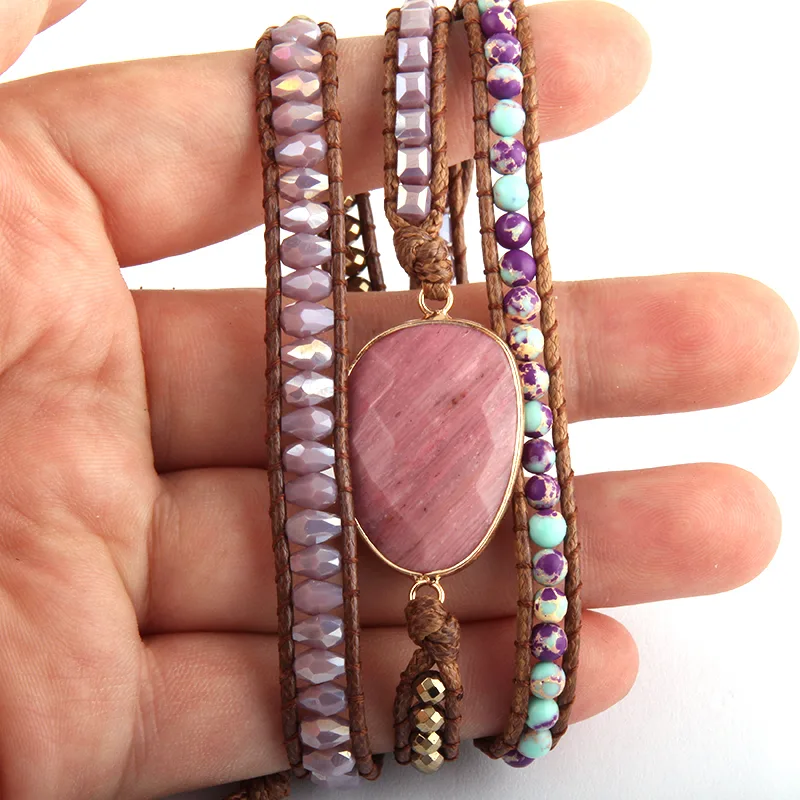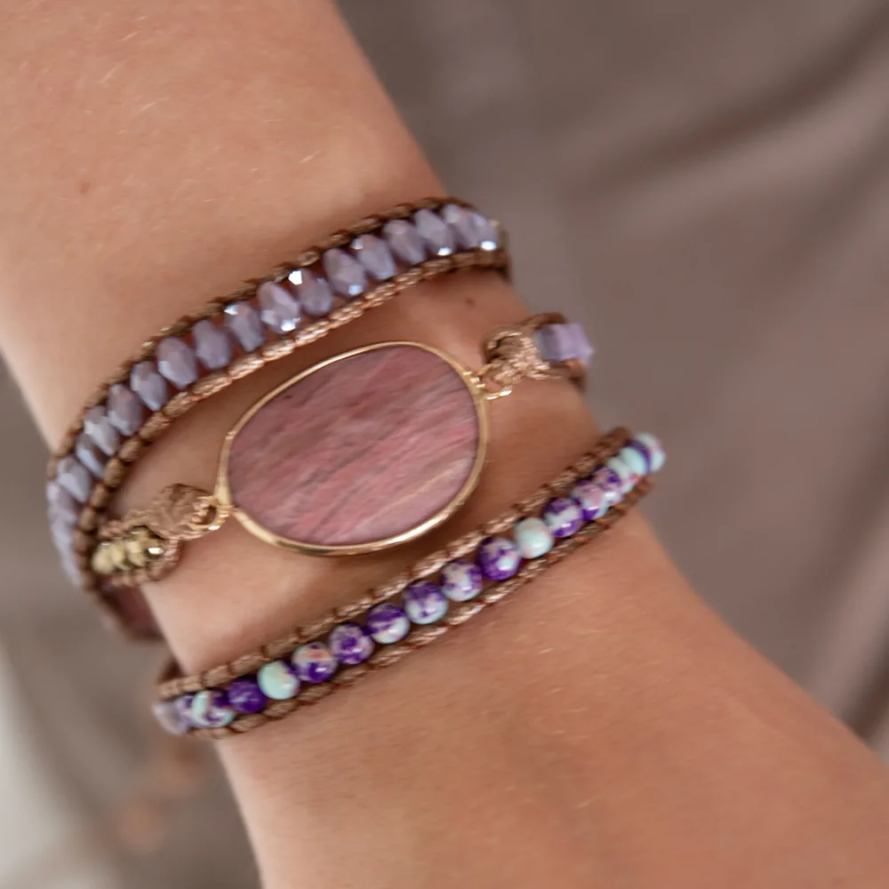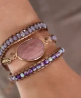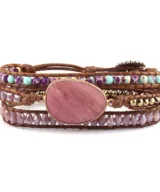 Deze trendy armband is handgemaakt van bruin vegan cord. De grote steen is een roze Rhodoniet edelsteen. Verder is deze armband voorzien van kleine kralen vervaardigd uit Jaspis in verschillende blauwe en paarse tinten. De kleine goudkleurige en paarse kralen maken deze armband helemaal af! Deze prachtige wikkelarmband met als hoofdkleur roze is mooie aanvulling op je outfit met een bijzondere look. Geef de armband cadeau aan jezelf of iemand anders in onze luxe geschenkverpakking.
