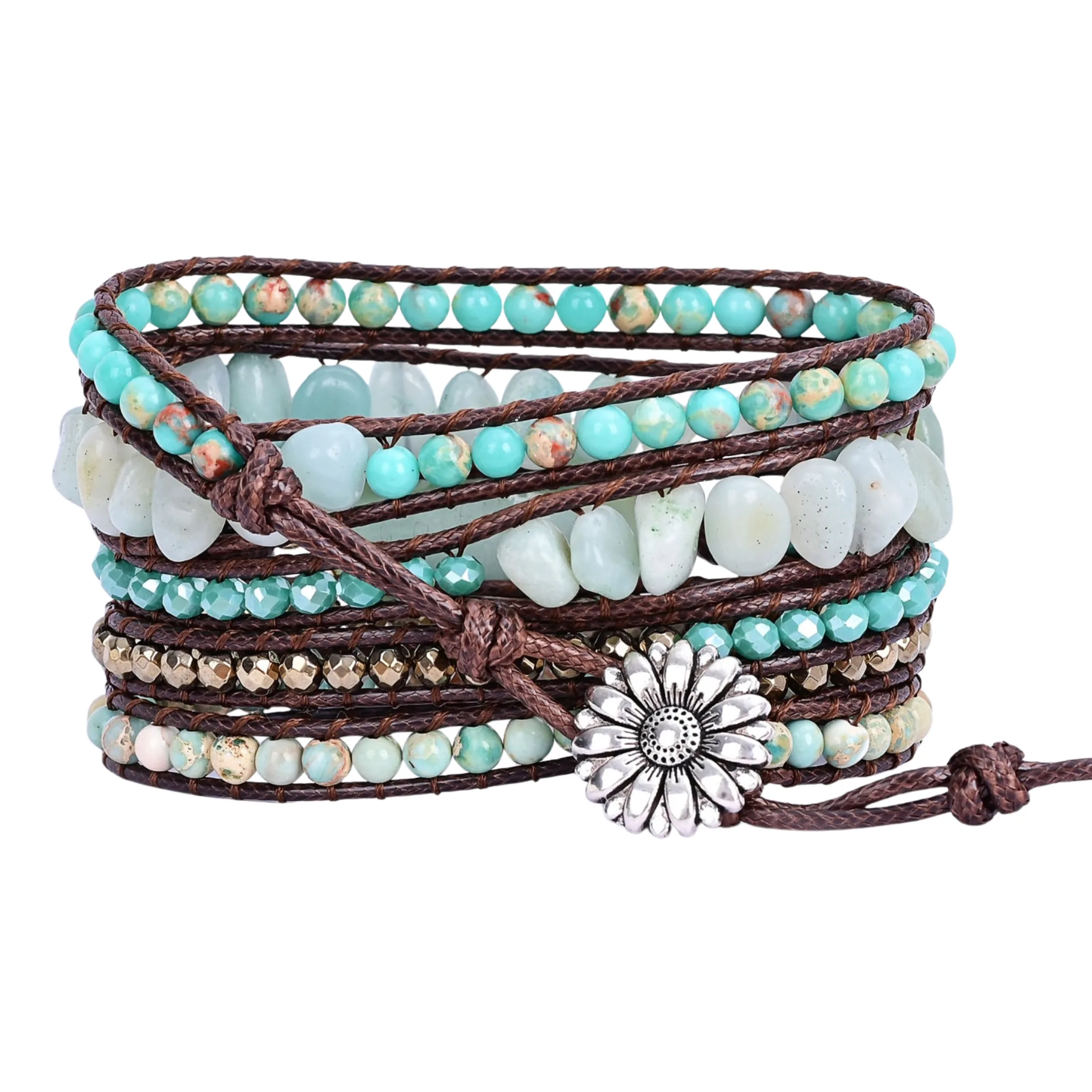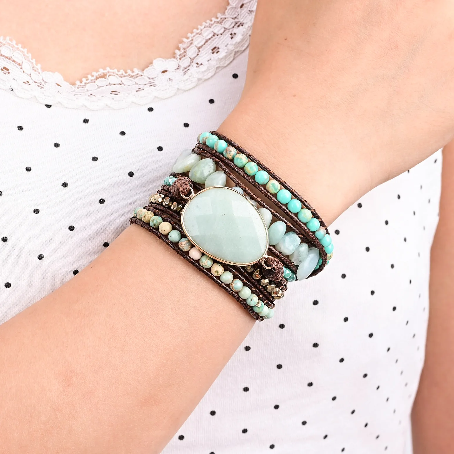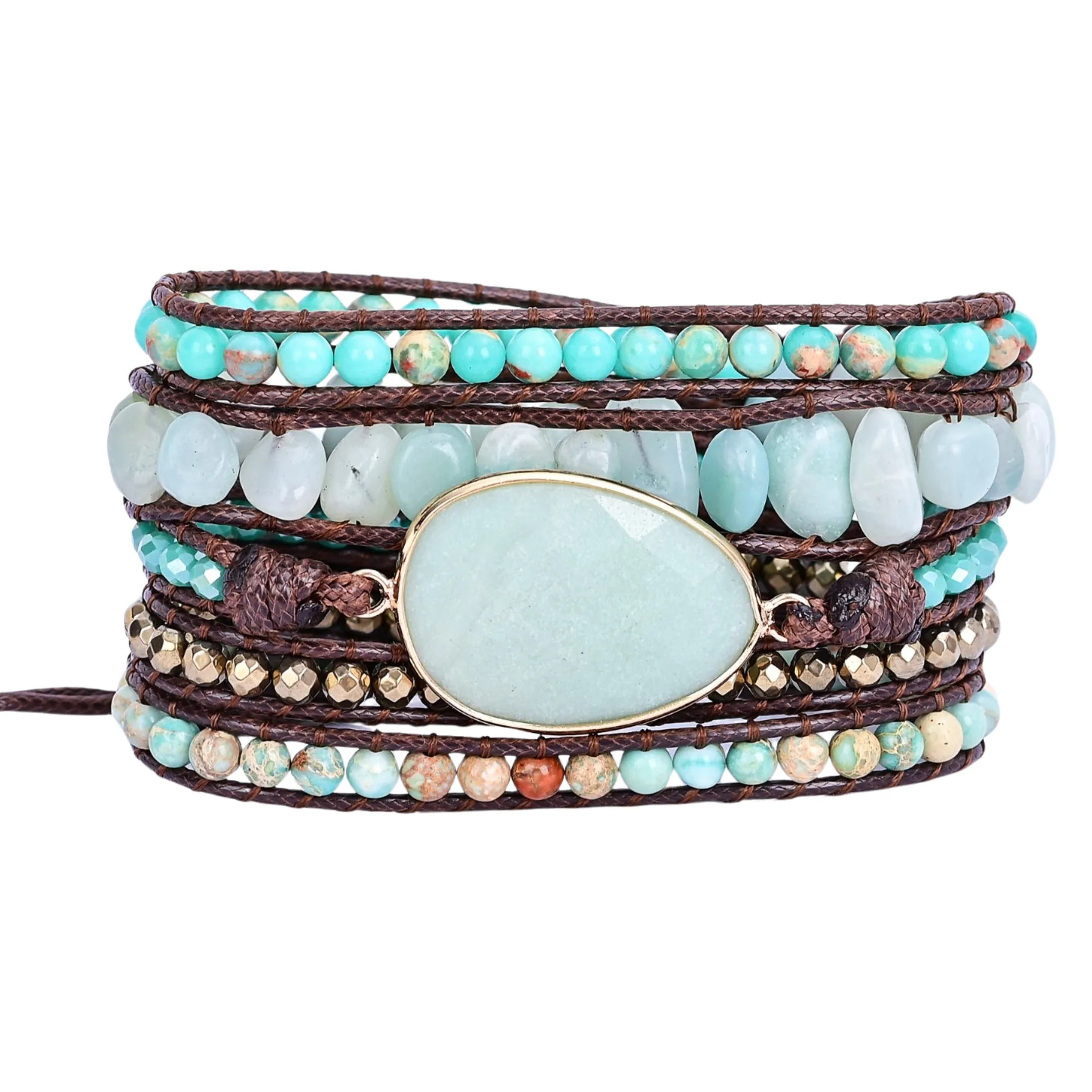 De Marama Wikkel Armband Rio Grande is een prachtige toevoeging aan je sieradencollectie. Deze armband is speciaal ontworpen voor dames die houden van een chique boho stijl. De hoofdsteen van lichtblauw amazoniet met gouden omlijsting maakt deze armband uniek en stijlvol.