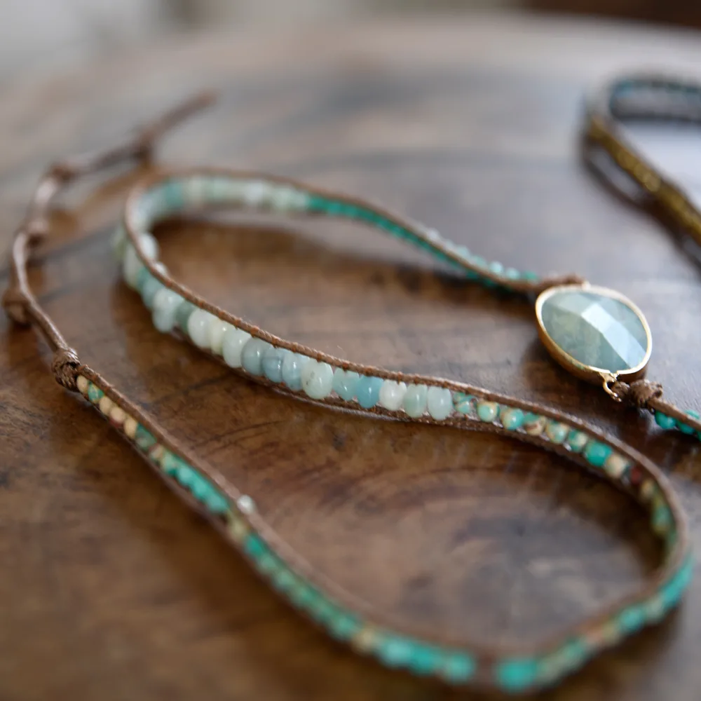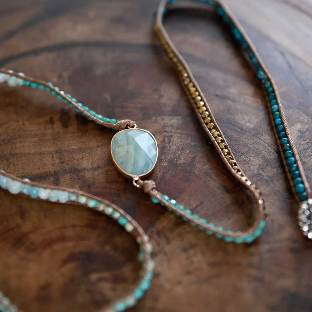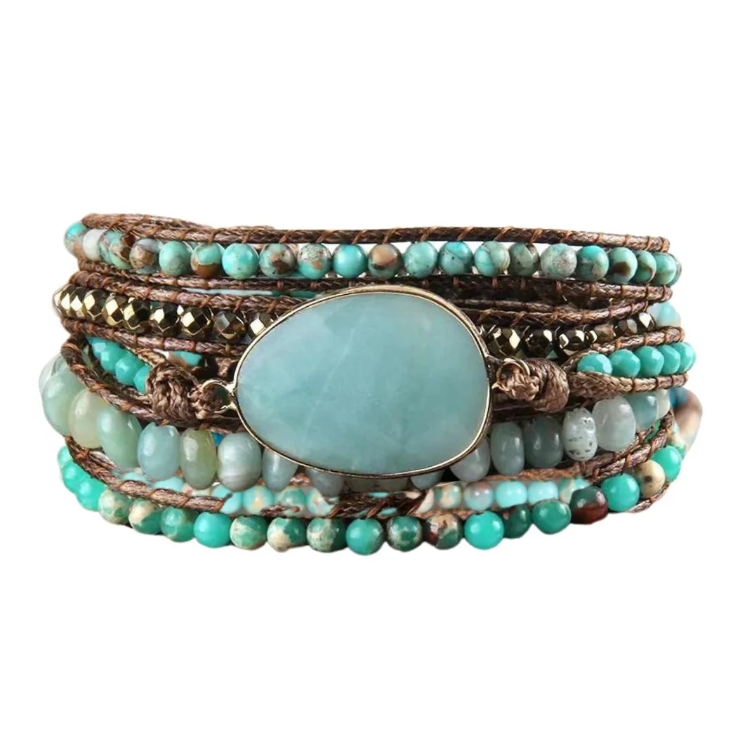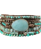 De Marama Wikkel Armband Rio Grande is een prachtige toevoeging aan je sieradencollectie. Deze armband is speciaal ontworpen voor dames die houden van een chique boho stijl. De hoofdsteen van lichtblauw amazoniet met gouden omlijsting maakt deze armband uniek en stijlvol.