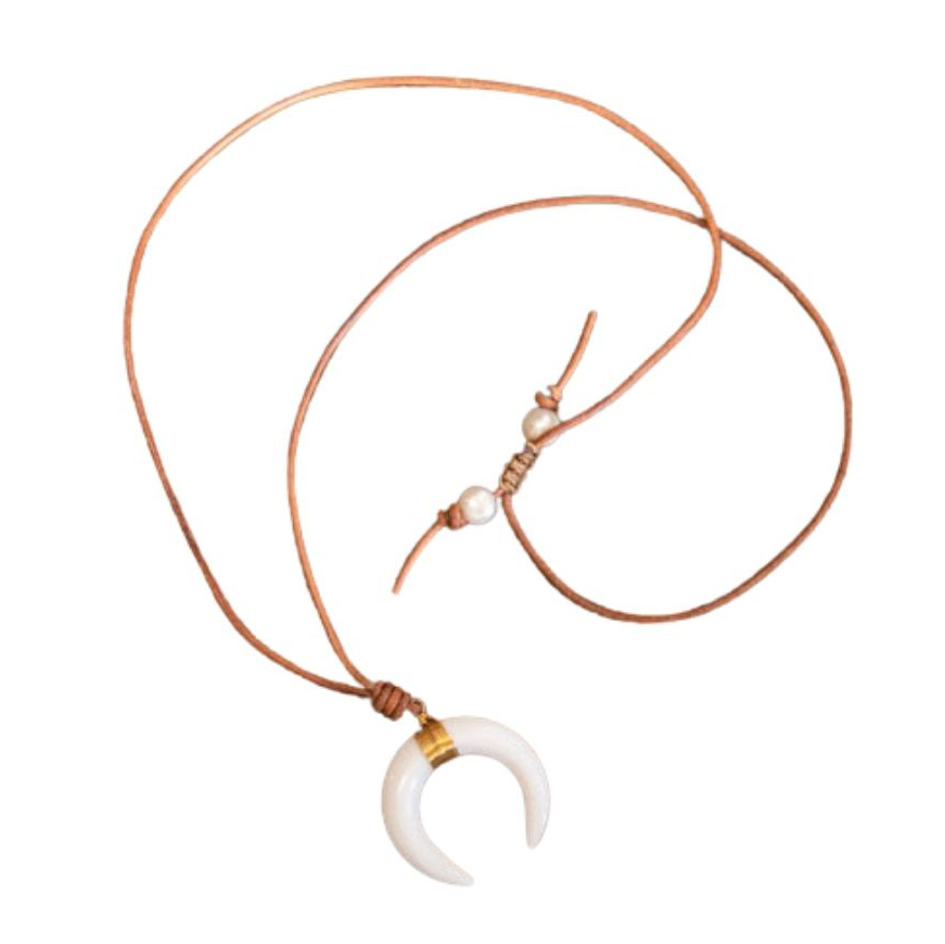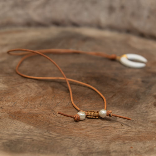 De ketting heeft een hanger in de vorm van een halve maan, vervaardigd uit schelpensteen.