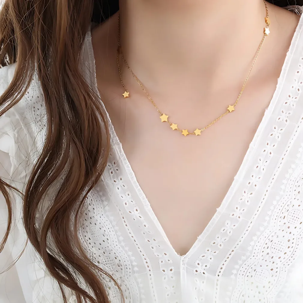 De ketting is versierd met verfijnde sterretjes, die een speels en toch stijlvolle touch bieden. Dankzij het verstelbare design kun je de ketting gemakkelijk aanpassen aan jouw gewenste lengte, zodat hij altijd perfect past bij elke halslijn. Ideaal om te dragen tijdens de feestdagen!