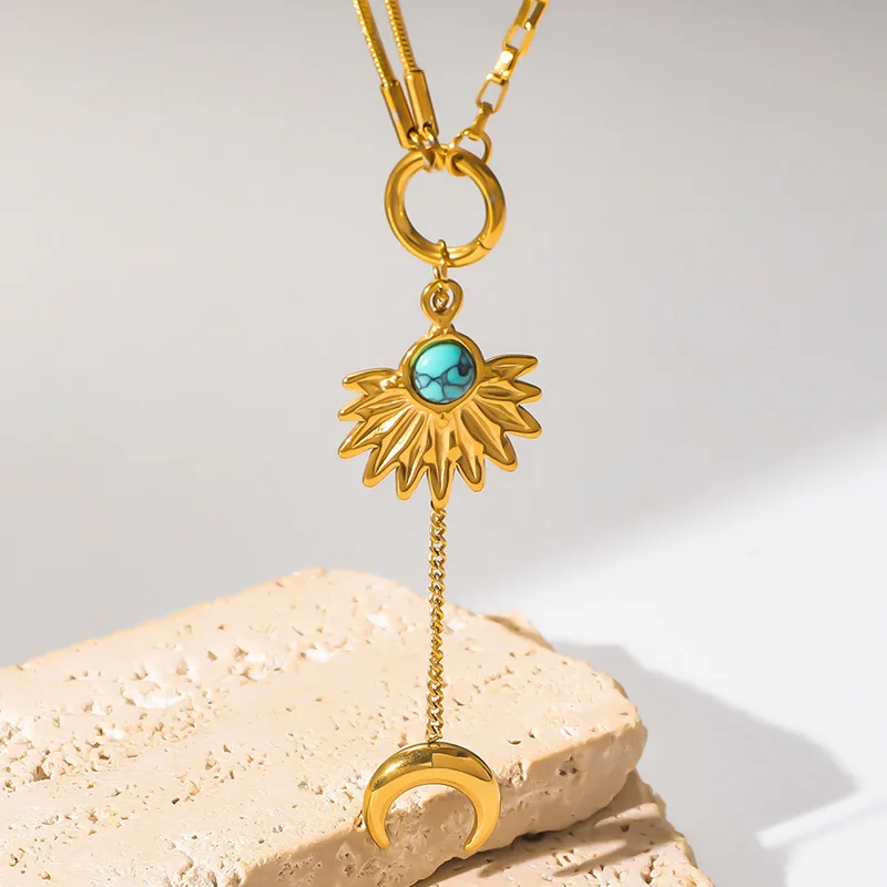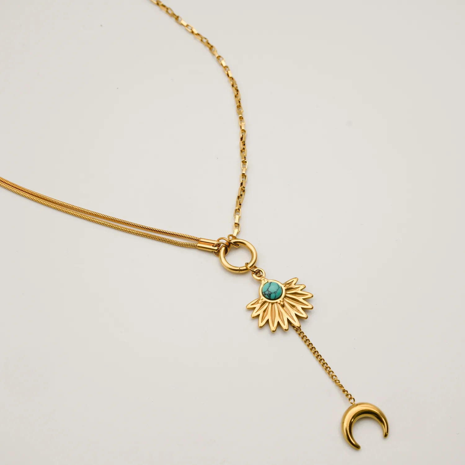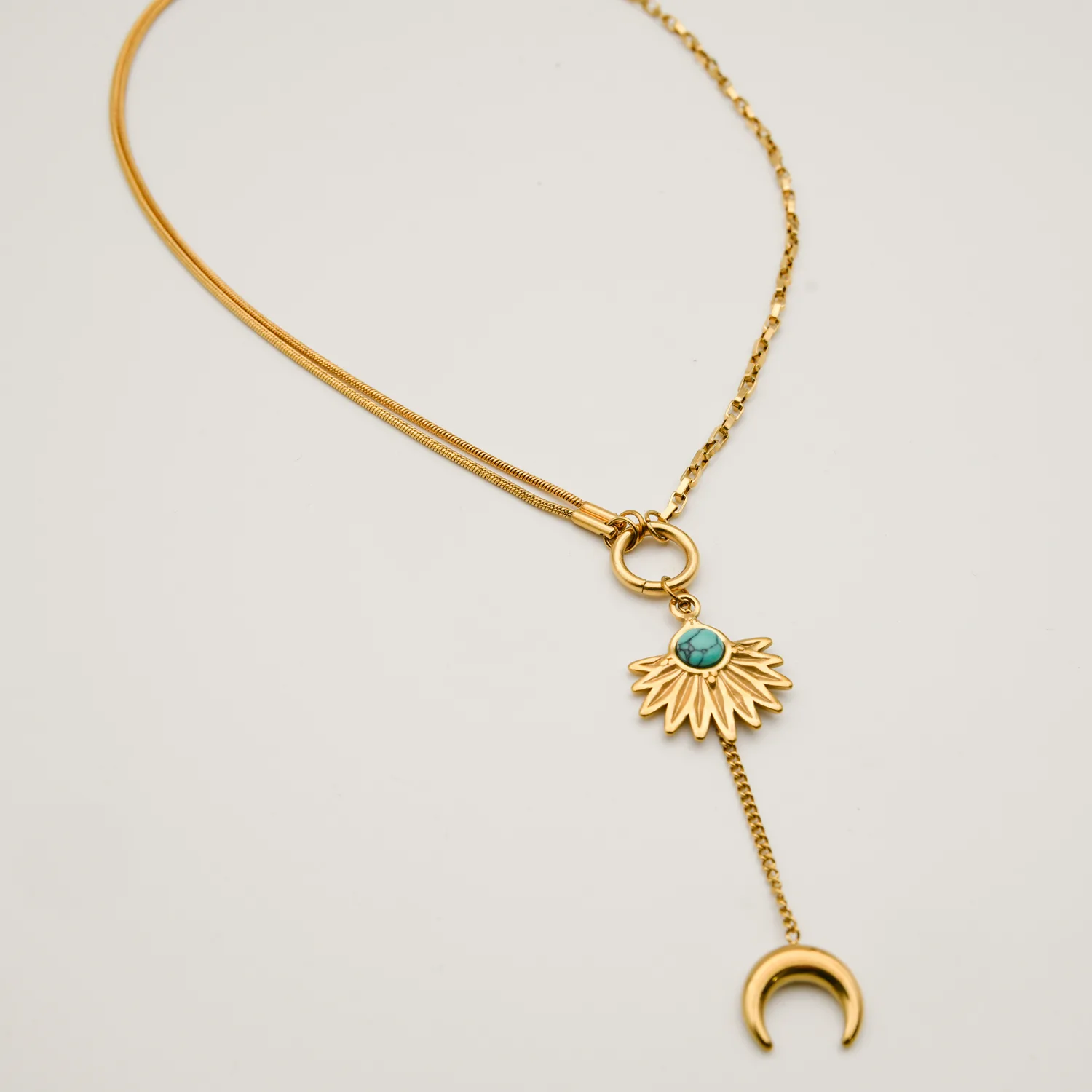 De ketting bestaat uit twee hangers in de vorm van een maan die subtiel en elegant is, en met een schitterend turkoois steentje dat een vleugje kleur en betekenis toevoegt. Turkoois staat bekend om zijn beschermende en rustgevende eigenschappen, waardoor deze ketting niet alleen een modeaccessoire is, maar ook een spirituele betekenis kan hebben.