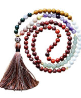 De Mala is een kralensnoer dat in het boeddhisme en het hindoeïsme wordt gebruikt voor meditaties en gebeden. Volgens de traditie houd je de Mala vast in je rechterhand, en glijd je met je duim over elke kraal, terwijl je je gebed, mantra of meditatie herhaalt, 108 keer. Deze meditatieve handeling herinnert je eraan om je bewust te zijn van waar je bent en het roept de eindeloze mogelijkheden op die de toekomst voor je in het verschiet heeft. De 7 verschillende gekleurde edelstenen staan symbool voor de 7 chakra’s.