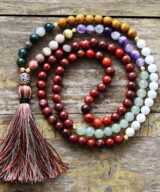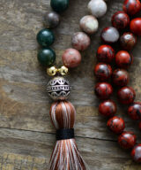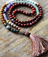 Deze prachtige Mala ketting met edelstenen en een kwastje is een trendy sieraad, maar uiteraard ook zeer geschikt om te gebruiken tijdens het mediteren.