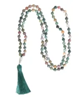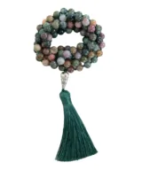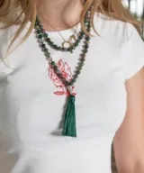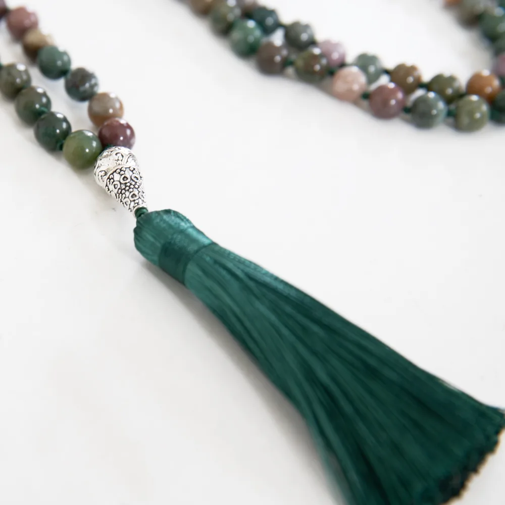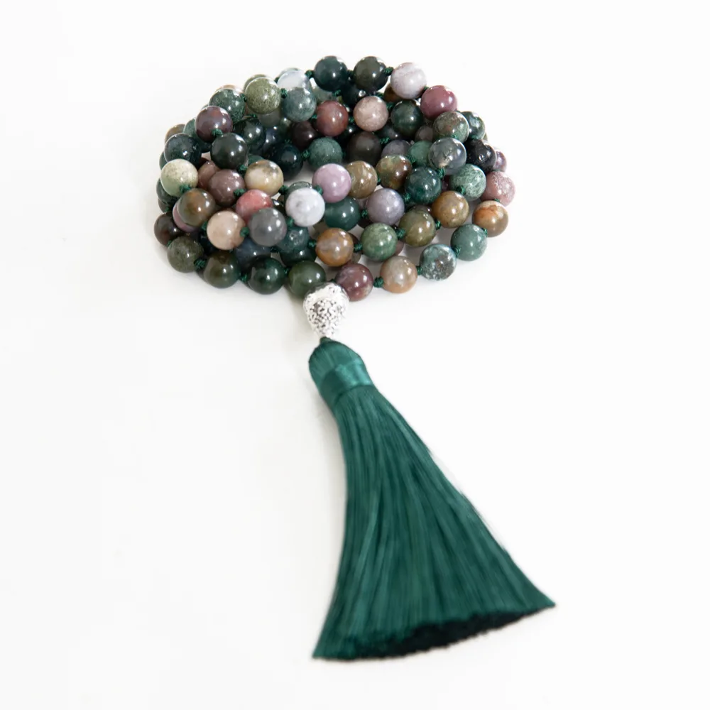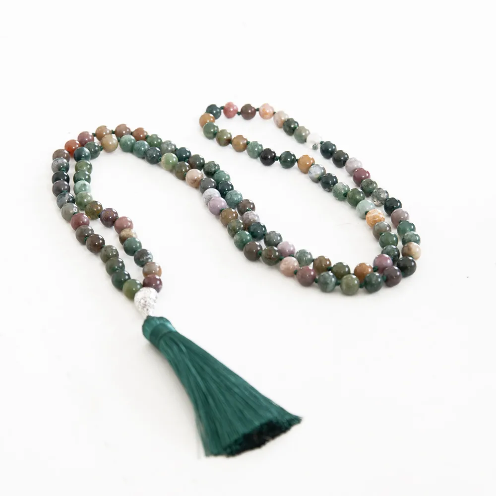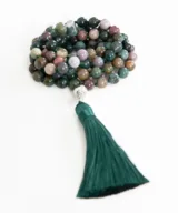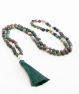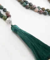 Deze prachtige Mala ketting met ronde kralen vervaardigd van de edelsteen Agaat heeft een donkergroen kwastje en is een trendy sieraad. De ketting kan ook als armband worden gedragen, maar is uiteraard ook zeer geschikt om te gebruiken tijdens het mediteren.