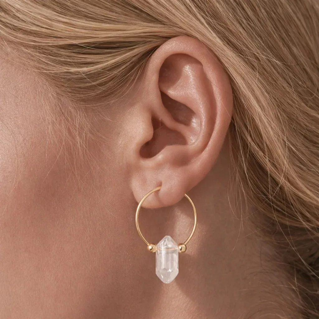 Voeg een stijlvolle en natuurlijke touch toe aan je sieradencollectie met deze elegante Crystal hoop oorringen. De combinatie van kristal edelstenen en goudkleurig hypoallergeen stainless steel zorgt voor een luxe uitstraling die moeiteloos past bij zowel dagelijkse outfits als feestelijke looks.
