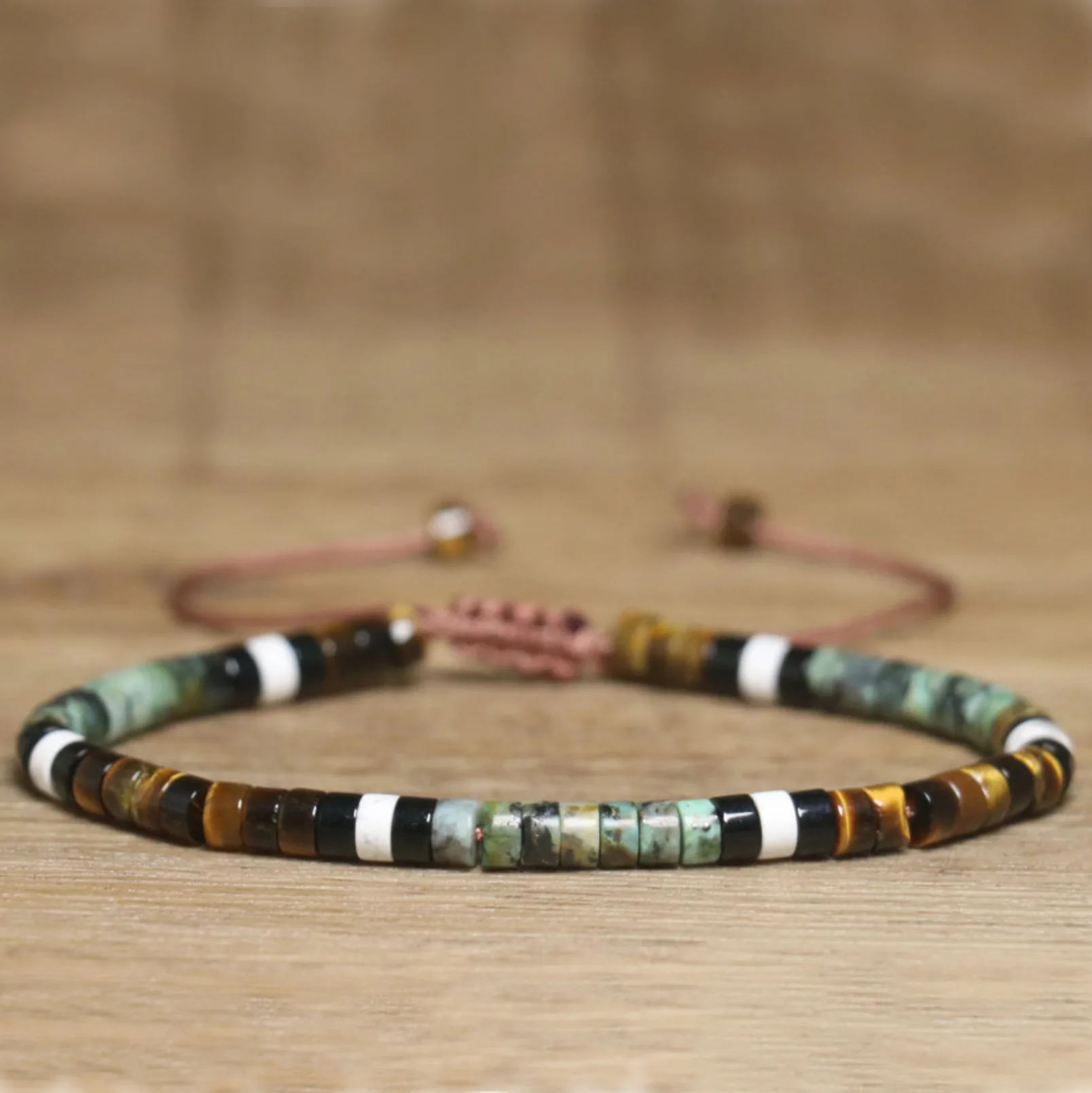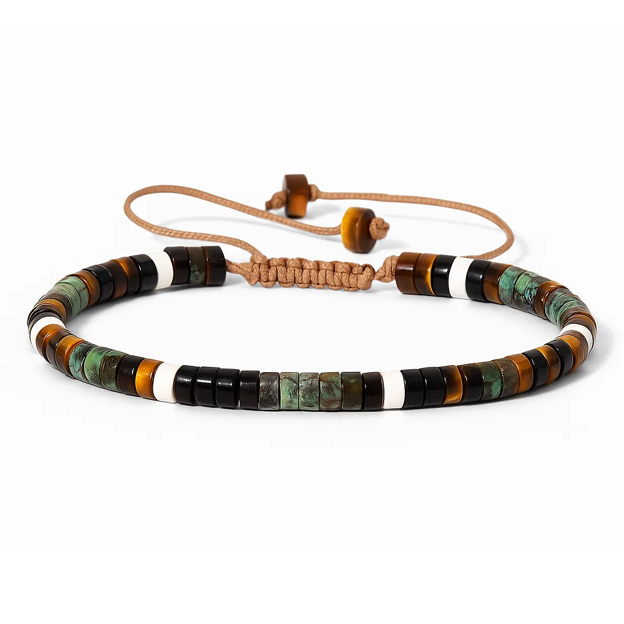 Deze stoere herenarmband van Marama is een perfecte aanvulling op je sieradencollectie. Gemaakt van bruin waxcord en versierd met groene, zwarte, bruine en witte edelstenen, straalt deze armband een unieke charme uit. De Afrikaanse Jaspisedelstenen zorgen voor een robuuste en stijlvolle uitstraling.