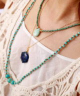 De ketting beschikt over natuurlijke kralen vervaardigd uit de edelsteen Turkoois, welke worden afgewisseld met metalen bronskleurige kralen.