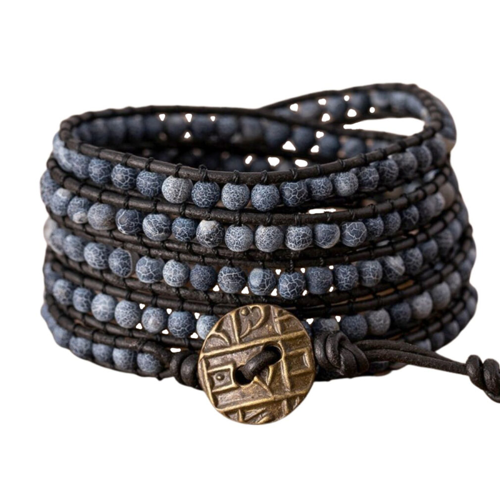 Deze schitterende armband is handgemaakt van zwart leer en de edelsteen Agaat. De armband past 5x om je pols. Een leuke aanvulling op je outfit! De handgemaakte armband is voorzien van een bronskleurige ronde knoop van metaal met een afbeelding van tekens en strepen.