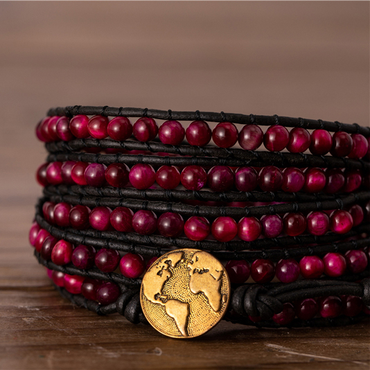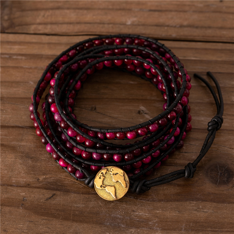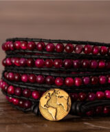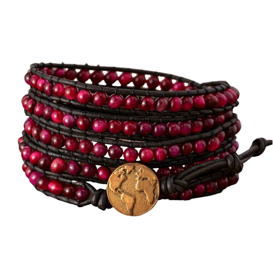 Deze schitterende armband is handgemaakt van zwart leer en de edelsteen Roze Tijgeroog. De armband past 5x om je pols. Een leuke aanvulling op je outfit! De handgemaakte armband is voorzien van een goudkleurige ronde knoop van metaal met een afbeelding van een wereldkaart.