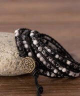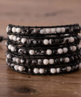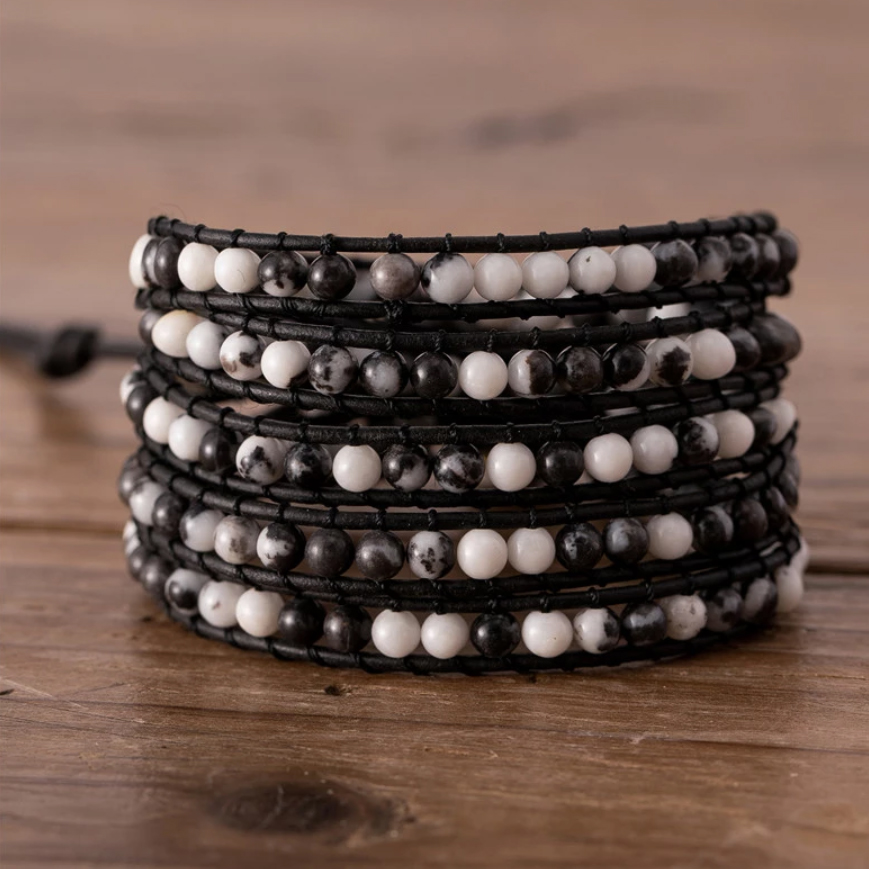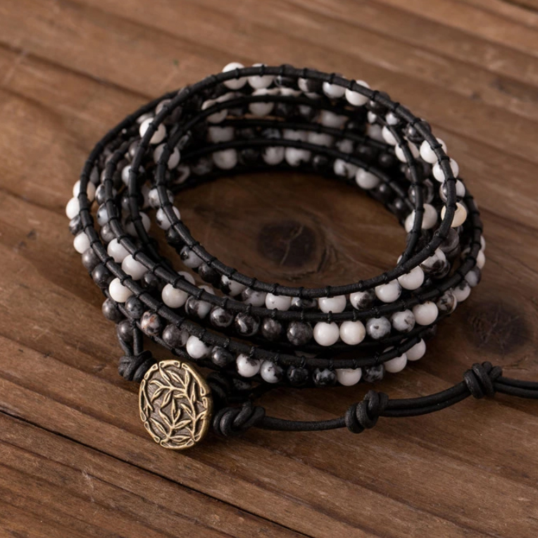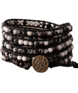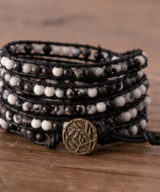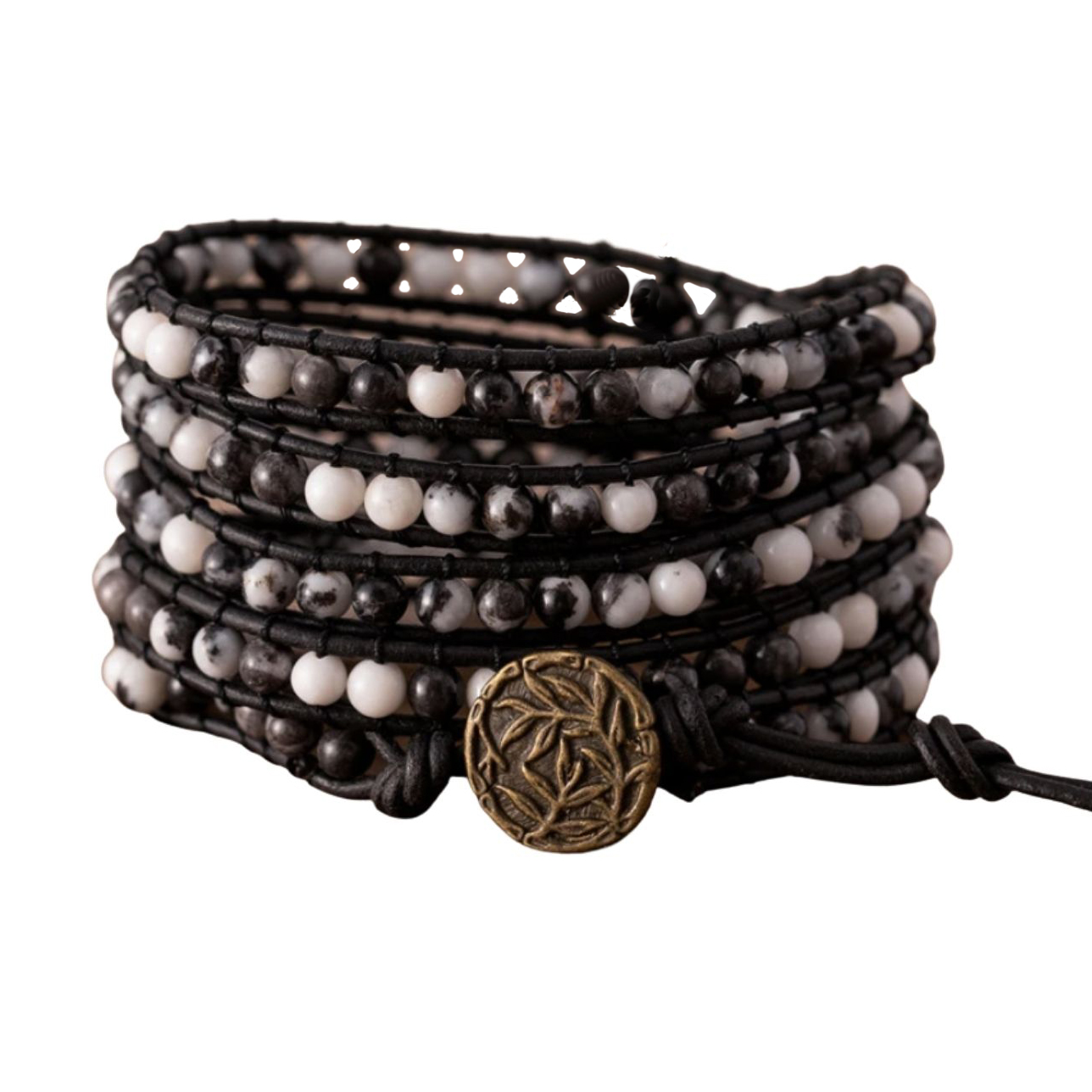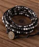 Deze schitterende armband is handgemaakt van zwart leer en de edelsteen Zebra Jaspis. De armband past 5x om je pols. Een leuke aanvulling op je outfit! De handgemaakte armband is voorzien van een bronskleurige ronde knoop van metaal met een afbeelding van takjes.