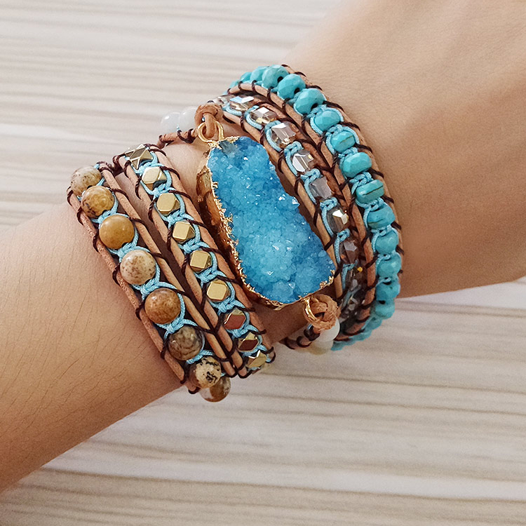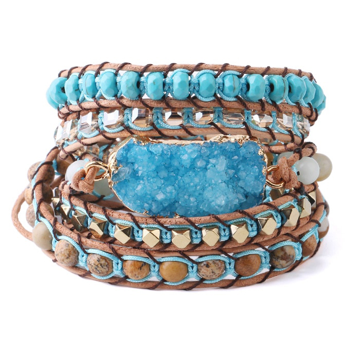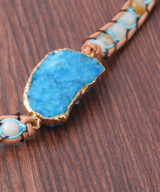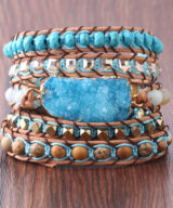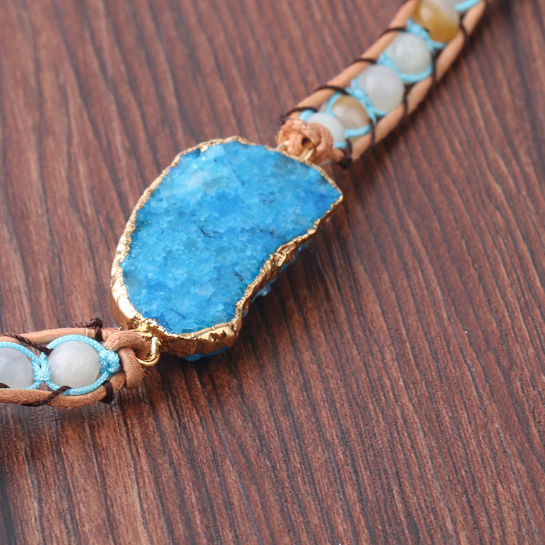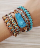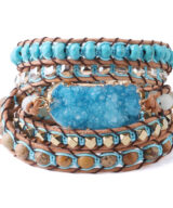 Deze trendy armband is handgemaakt van bruin leer en heeft als hoofdsteen een fonkelende blauwe Druzy Agaat edelsteen. Een prachtige armband die je casual of juist chique kunt dragen. De wikkelarmband is 72 cm lang en heeft 3 knoopsgaten, dus one size fits all! Een mooi cadeautje voor jezelf of iemand anders! Deze armband wordt geleverd in een luxe geschenkverpakking.